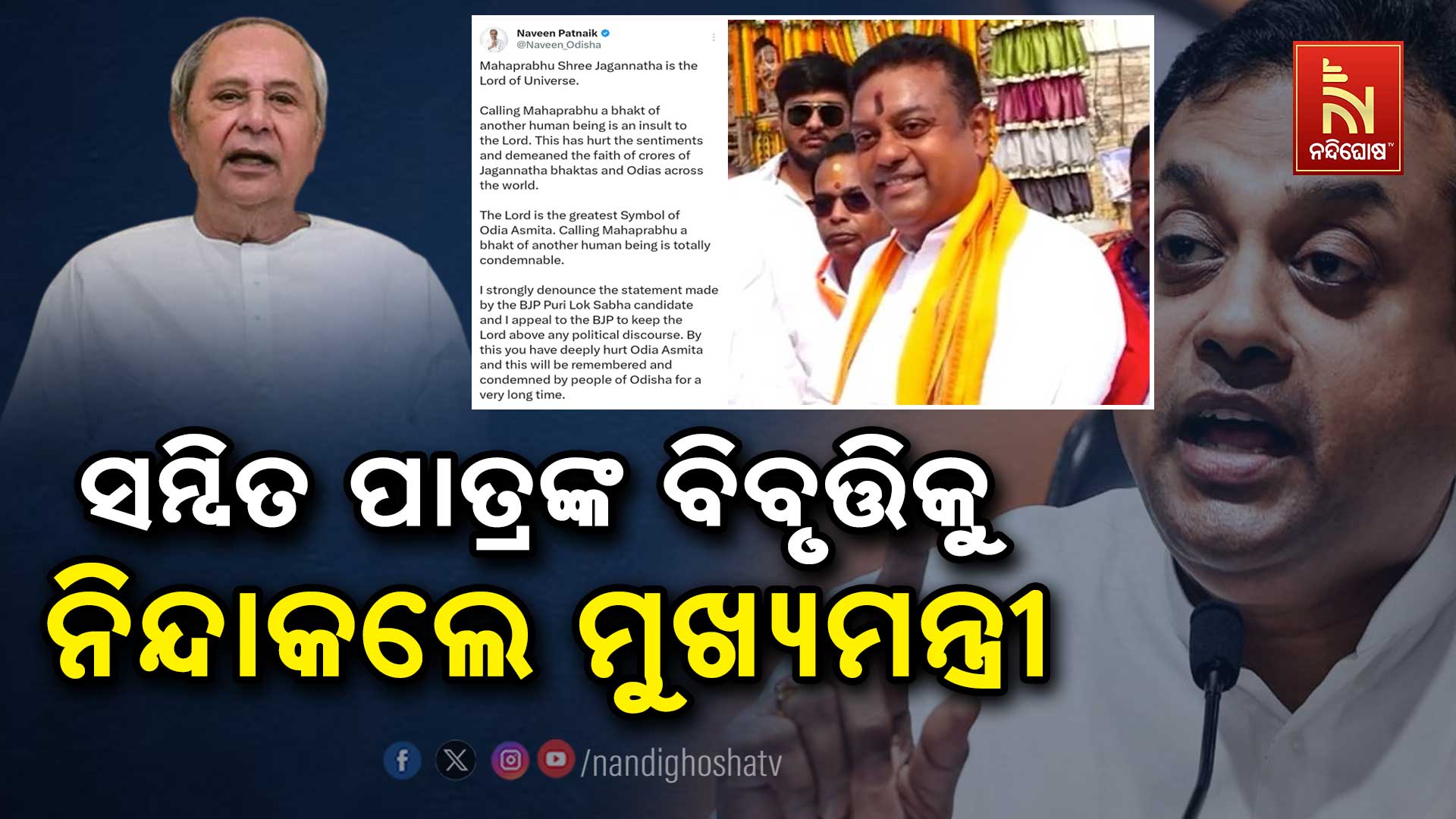 ଭୁବନେଶ୍ୱର : ମହାପ୍ରଭୁ ଶ୍ରୀ ଜଗନ୍ନାଥ ସମଗ୍ର ବିଶ୍ୱର ଠାକୁର ତାଙ୍କୁ ଅନ୍ୟ ଜଣେ ମନୁଷ୍ୟର ଭକ୍ତ କହିବା ମହାପ୍ରଭୁଙ୍କ ପ୍ରତି ସବୁଠୁ ବଡ଼ ଅପମାନ । ଏହା ବିଶ୍ୱର କୋଟି କୋଟି ଜଗନ୍ନାଥ ଭକ୍ତ ଓ ଓଡ଼ିଆ ମାନଙ୍କ ଭାବାବେଗ ଓ ବିଶ୍ୱାସକୁ କ୍ଷତାକ୍ତ କରିଛି । ମହାପ୍ରଭୁ ହେଉଛନ୍ତି ଓଡ଼ିଆ ଅସ୍ମିତାର ସବୁଠାରୁ ବଡ଼ ପ୍ରତିକ । ମହାପ୍ରଭୁଙ୍କୁ ଅନ୍ୟଜଣେ ମଣିଷର ଭକ୍ତ ବୋଲି କହିବା ସମ୍ପୂର୍ଣ୍ଣ ଭାବରେ ନିନ୍ଦନୀୟ । ମୁଁ ବିଜେପିର ପୁରୀ ଲୋକସଭା ପ୍ରାର୍ଥୀଙ୍କ ଏପରି ମନ୍ତବ୍ୟକୁ ଦୃଢ ନିନ୍ଦା କରୁଛି ଓ ମହାପ୍ରଭୁଙ୍କୁ ରାଜନୀତିରୁ ଉର୍ଦ୍ଧ୍ୱରେ ରଖିବାକୁ ବିଜେପିକୁ ଅପିଲ କରୁଛି । ଏହା କରି ଆପଣ ଓଡ଼ିଆ ଅସ୍ମିତାକୁ ଗଭିର ଭାବରେ ଆଘାତ ପହଞ୍ଚାଇଛନ୍ତି । ଯାହା ଓଡ଼ିଶାବାସୀ ଦୀର୍ଘଦିନ ପାଇଁ ମନେ ରଖିବେ ଆଉ ନିନ୍ଦା କରିବେ ।