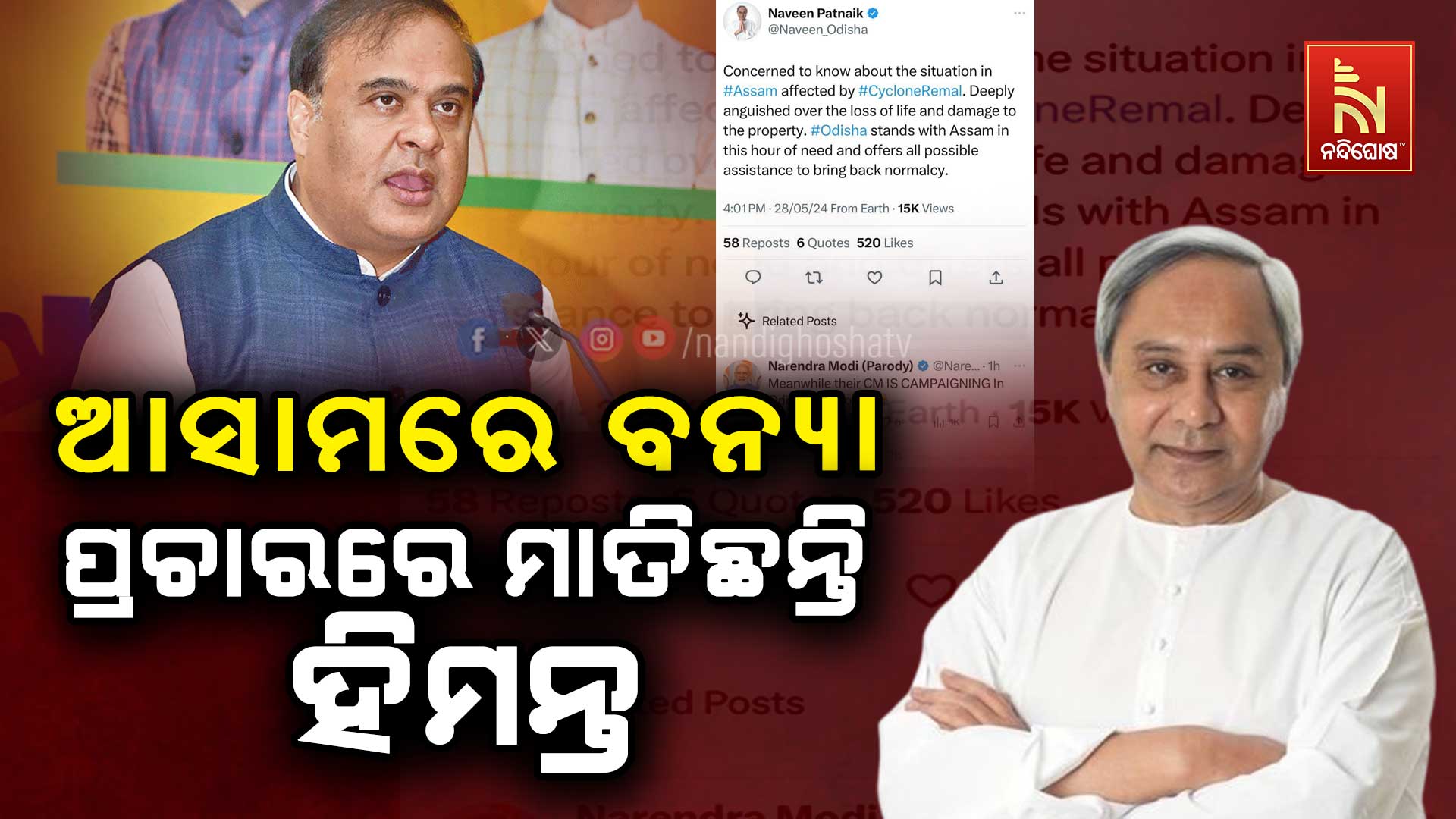ସେପଟେ ଆସାମ ମୁଖ୍ଯମନ୍ତ୍ରୀ ହିମନ୍ତ ବିଶ୍ବଶର୍ମା ନିଜ ରାଜ୍ଯବାସୀଙ୍କ ପାଇଁ ବେଫିକର। ଦୁର୍ଦ୍ଦଶାରେ ଲୋକେ ଜୁଝି ହେଉଥିବା ବେଳେ ଓଡ଼ିଶା ଆସି ନିର୍ବାଚନୀ ପ୍ରଚାରରେ ମାତିଛନ୍ତି ହିମନ୍ତ। କେବଳ ସେତିକି ନୁହେଁ ନବୀନଙ୍କ ପ୍ରତି ସେ ଅଶାଳୀନ ମନ୍ତବ୍ଯ ବି ଦେଇଛନ୍ତି। ହେଲେ ନବୀନ କିନ୍ତୁ ବଡ ଦିଲ ବାଲା। କିଏ କଣ କହିଲା ସେଥିପାଇଁ ତାଙ୍କ ଧ୍ଯାନ ନାହିଁ। ଆସାମର ବର୍ଷା ବନ୍ଯା ସ୍ଥିତିରେ ଉଦବେଗ ପ୍ରକାଶ କରିବା ସହ ସହଯୋଗ ପାଇଁ ଆଗେଇ ଆସିଛନ୍ତି।