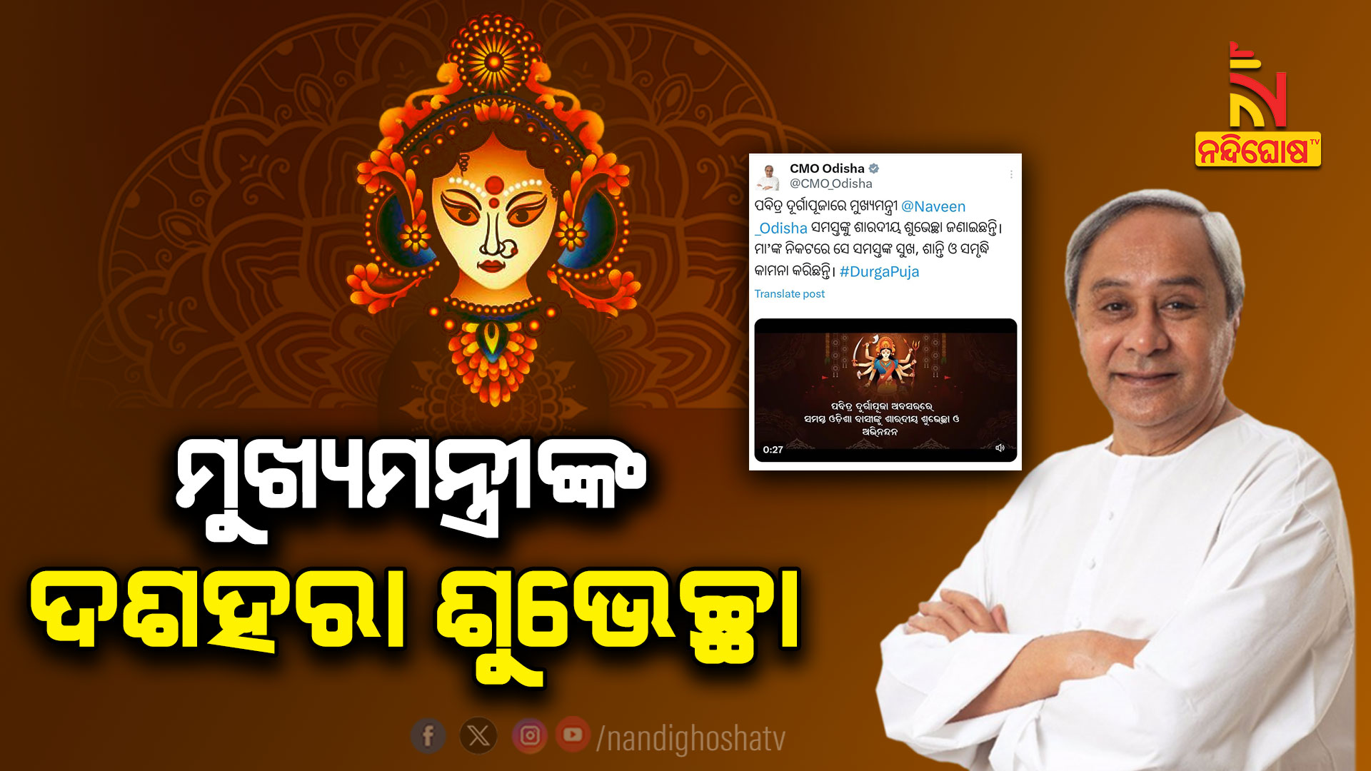 ଭୁବନେଶ୍ବର: ଶାରଦୀୟ ଦୁର୍ଗାପୂଜା ଅବସରରେ ରାଜ୍ୟବାସୀଙ୍କୁ ଶୁଭେଚ୍ଛା ଜଣାଇଛନ୍ତି ମୁଖ୍ୟମନ୍ତ୍ରୀ ନବୀନ ପଟ୍ଟନାୟକ । ମା’ଙ୍କ ନିକଟରେ ରାଜ୍ୟବାସୀଙ୍କ ସୁଖ, ଶାନ୍ତି ଓ ସମୃଦ୍ଧି କାମନା କରିଛନ୍ତି । ପାର୍ବଣର ଅମୃତ ଲଗ୍ନରେ ମା’ଙ୍କ ଆଶୀର୍ବାଦ ସମସ୍ତଙ୍କ ଜୀବନରେ ଶାନ୍ତି ଓ ଆନନ୍ଦ ଭରି ଦେଉ ବୋଲି ପ୍ରାର୍ଥନା କରୁଛି କହିଛନ୍ତି ମୁଖ୍ୟମନ୍ତ୍ରୀ ।