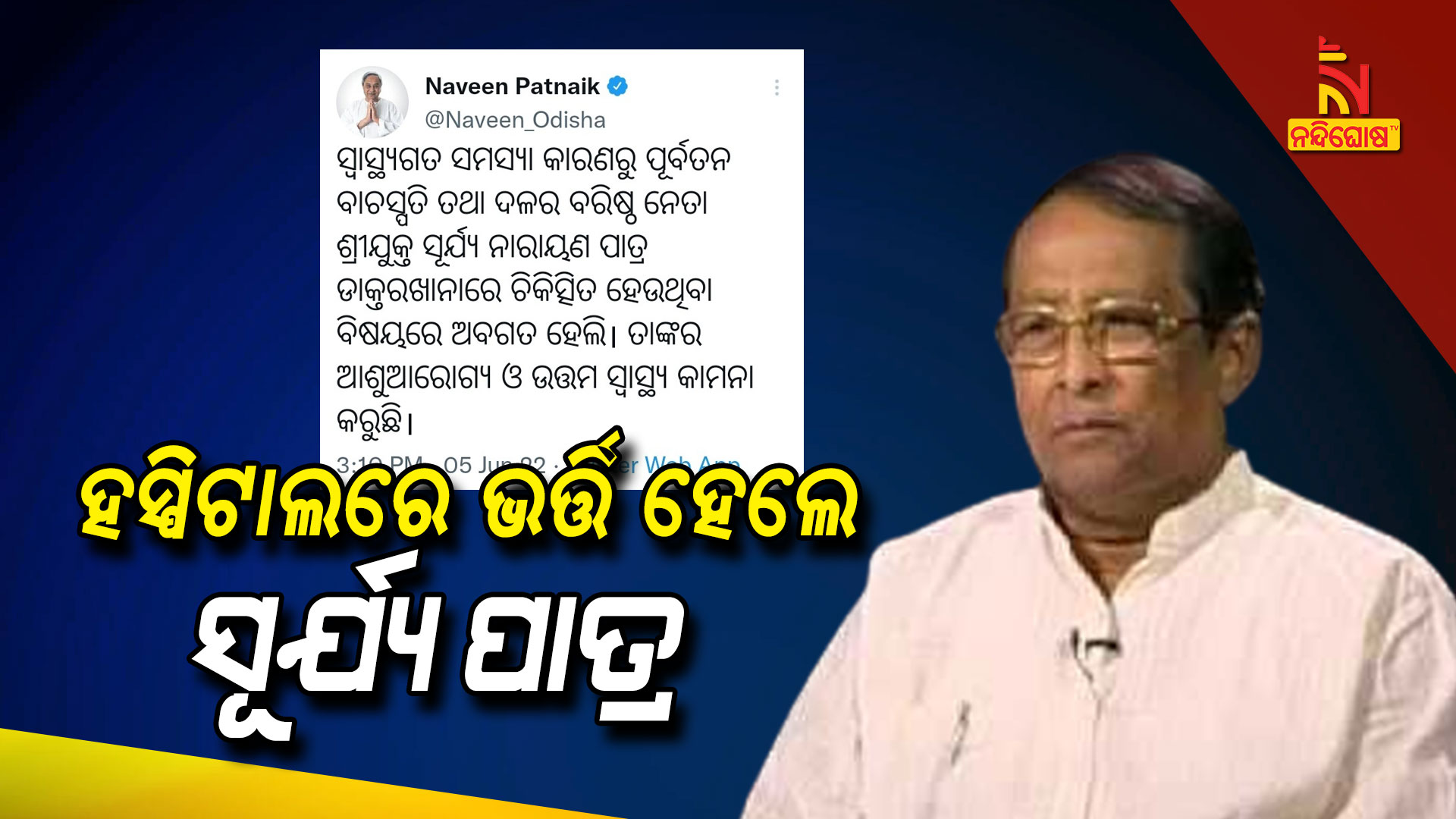 ଭୁବନେଶ୍ୱର: ପୂର୍ବତନ ବାଚସ୍ପତି ସୂର୍ଯ୍ୟ ନାରାୟଣ ପାତ୍ର ଅସୁସ୍ଥ । ସ୍ୱାସ୍ଥ୍ୟଗତ ସମସ୍ୟା କାରଣରୁ ତାଙ୍କୁ ହସ୍ପିଟାଲରେ ଭର୍ତ୍ତି କରାଯାଇଛି । ମୁଖ୍ୟମନ୍ତ୍ରୀ ନବୀନ ପଟ୍ଟନାୟକ ଅସୁସ୍ଥ ସୂର୍ଯ୍ୟ ନାରାୟଣ ପାତ୍ରଙ୍କ ଆଶୁ ଆରୋଗ୍ୟ କାମନା କରିଛନ୍ତି । ମୁଖ୍ୟମନ୍ତ୍ରୀ ଟ୍ୱିଟ କରି କହିଛନ୍ତି କି ’ସ୍ୱାସ୍ଥ୍ୟଗତ ସମସ୍ୟା କାରଣରୁ ପୂର୍ବତନ ବାଚସ୍ପତି ତଥା ଦଳର ବରିଷ୍ଠ ନେତା ଶ୍ରୀଯୁକ୍ତ ସୂର୍ଯ୍ୟ ନାରାୟଣ ପାତ୍ର ଡାକ୍ତରଖାନାରେ ଚିକିତ୍ସିତ ହେଉଥିବା ବିଷୟରେ ଅବଗତ ହେଲି । ତାଙ୍କର ଆଶୁ ଆରୋଗ୍ୟ ଓ ଉତ୍ତମ ସ୍ୱାସ୍ଥ୍ୟ କାମନା କରୁଛି ।