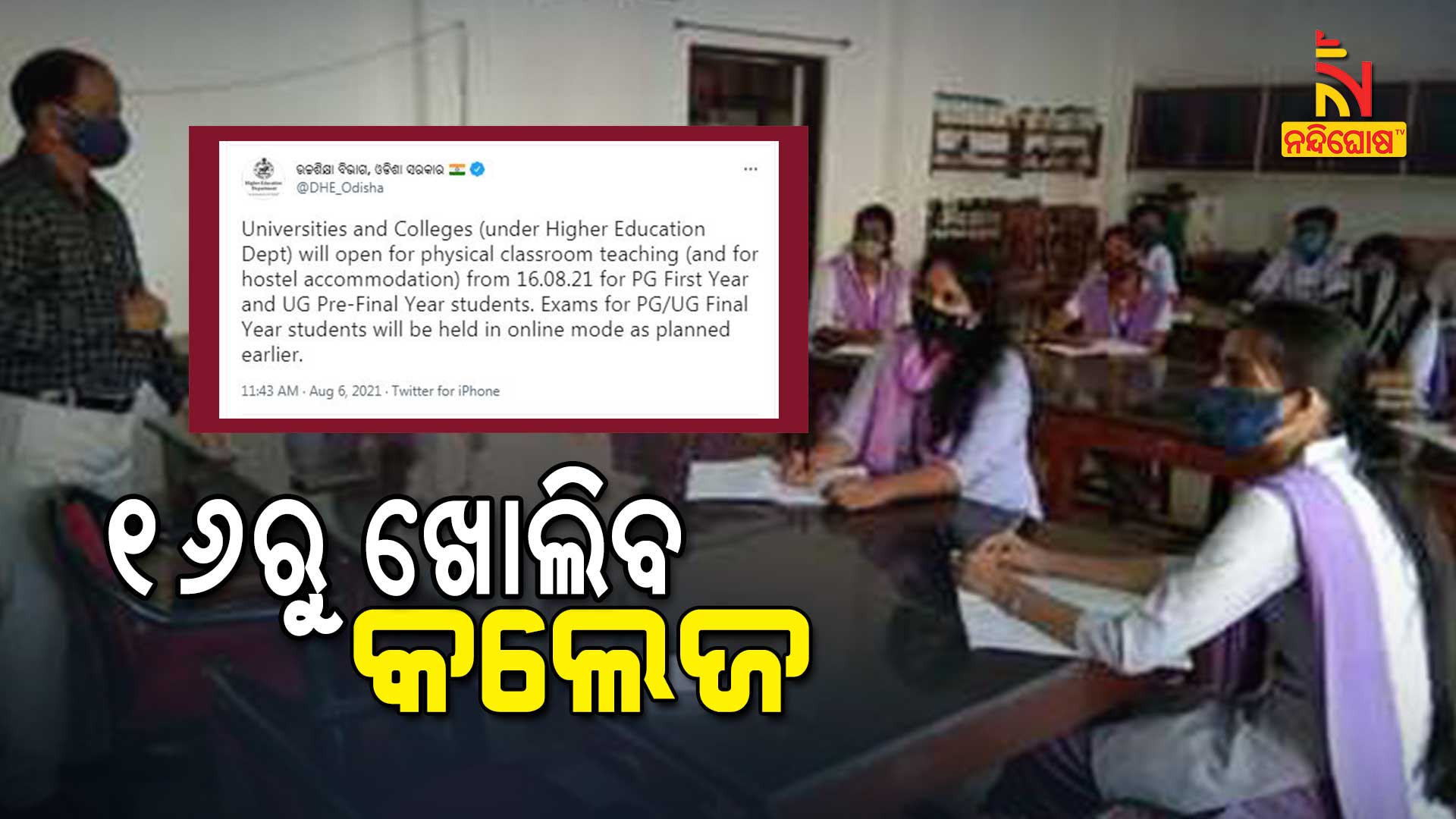 ଟ୍ୱିଟ୍ ସୂଚନା ଅନୁଯାୟୀ, ଉଚ୍ଚଶିକ୍ଷା ବିଭାଗ ଅଧୀନସ୍ଥ ସମସ୍ତ ୟୁନିଭର୍ସିଟି ଓ କଲେଜ ଖୋଲାଯିବ । ଏବଂ ଅଫଲାଇନ୍ରେ କ୍ଳାସ୍ ହେବ । ପିଜି ପ୍ରଥମ ବର୍ଷ ୟୁଜି ପ୍ରି ଫାଇନାଲ ବର୍ଷର ଛାତ୍ରଛାତ୍ରୀଙ୍କ ପାଇଁ ହଷ୍ଟେଲ ମଧ୍ୟ ଖୋଲାଯିବ । ତେବେ ପୂର୍ବ ନିଷ୍ପତ୍ତି ଅନୁଯାୟୀ ପିଜି ଏବଂ ୟୁଜି ଶେଷ ବର୍ଷ ଛାତ୍ରଛାତ୍ରୀଙ୍କ ପରୀକ୍ଷା ଅନ୍ଲାଇନ୍ ମାଧ୍ୟମରେ ହେବ ।