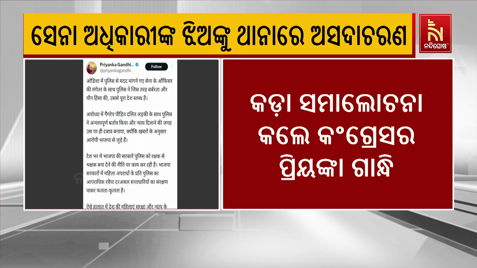 ନନ୍ଦିଘୋଷ ବ୍ୟୁରୋ : ଭରତପୁର ଥାନାରେ ଜଣେ ବ୍ରିଗେଡିୟରଙ୍କ ଝିଅକୁ, ଜଣେ ମେଜରଙ୍କ ବାନ୍ଧବୀଙ୍କୁ ଅସଦାରଣ, ନିସ୍ତୁକ ମାଡ଼ ମାରିବା ଘଟଣା ସାରା ଦେଶକୁ ଲଜ୍ଜିତ କରିଛି ବୋଲି କରିଛନ୍ତି କଂଗ୍ରେସ ନେତ୍ରୀ ପ୍ରିୟଙ୍କା ଗାନ୍ଧି। ସାରା ଦେଶରେ ପୁଲିସକୁ ରକ୍ଷକରୁ ଭକ୍ଷକ କରିବାର ନୀତି କରୁଛି। ବିଜେପି ସରକାରରେ ମହିଳା ବିରୋଧୀ ଅପରାଧର ଅଭିଯୁକ୍ତଙ୍କୁ ସୁରକ୍ଷା ଦେଉଥିବାରୁ ଏପରି ହେଉଥିବା ଅଭିଯୋଗ କରିଛନ୍ତି ପ୍ରିୟଙ୍କା ଗାନ୍ଧି। ଏପରି ପରିସ୍ଥିତିରେ ସୁରକ୍ଷା ପାଇଁ, ନ୍ୟାୟ ପାଇବାକୁ ମହିଳାମାନେ କଣ କରିବେ, କାହା ପାଖକୁ ଯିବେ ବୋଲି ପ୍ରଶ୍ନ କରିଛନ୍ତି ପ୍ରିୟଙ୍କା ଗାନ୍ଧି।