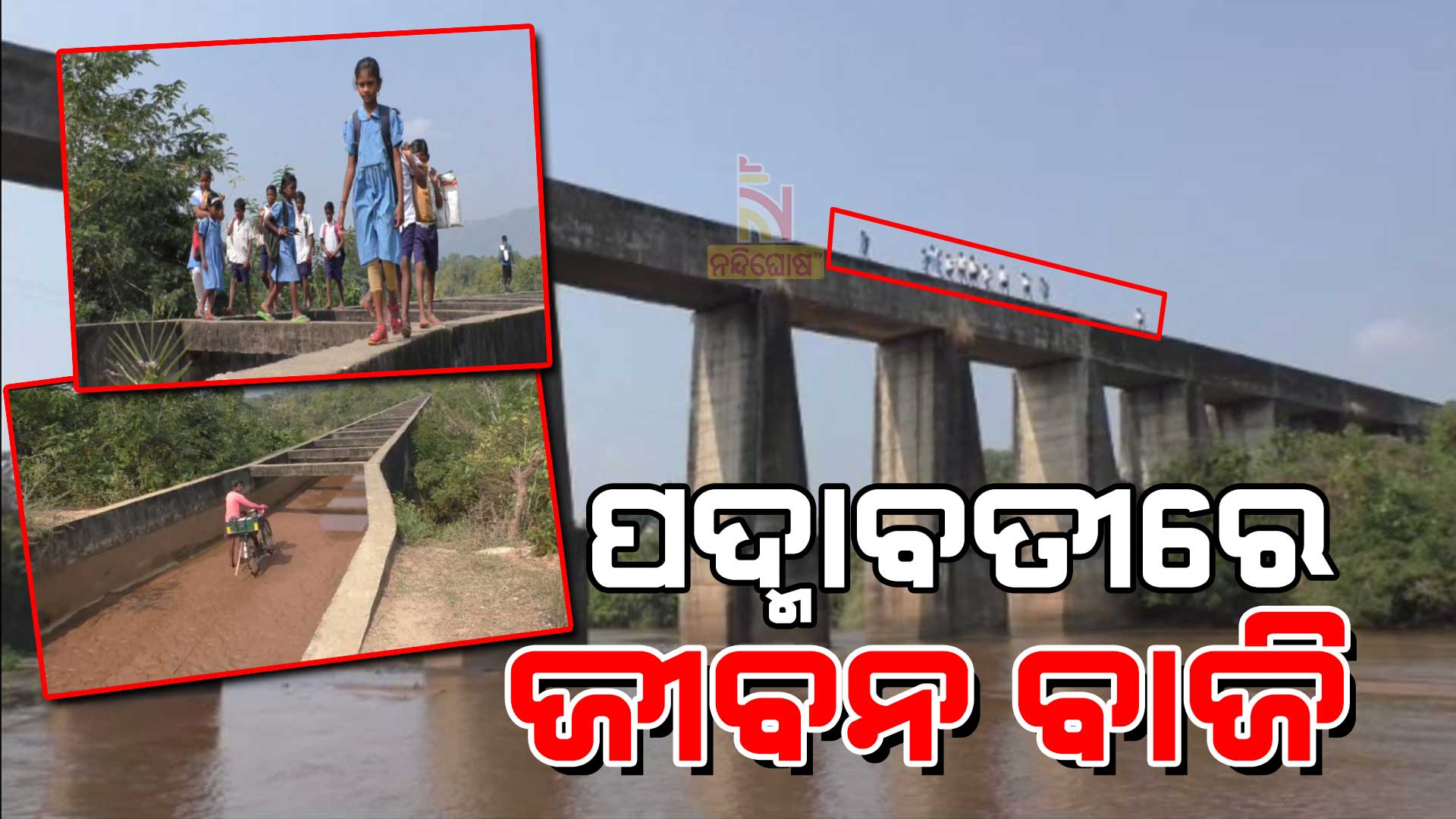 ଭଞ୍ଜନଗର: ଉପରେ ଆତଙ୍କର ଆକାଶ, ତଳେ ଭରା ନଈର ଭୟ । ଯାତ୍ରାର ପାଦେ ପାଦେ ବିପଦ । ୟା ଭିତରେ ପଦ୍ମାବତୀକୁ ପାର୍ କରିବାକୁ ଜୀବନ ଲାଗୁଛି ବାଜି । ମୃତ୍ୟୁ ସହ ଲଢ଼େଇ କରି ସ୍କୁଲ୍ରେ ପହଞ୍ଚୁଛନ୍ତି ଏ ପିଲାମାନେ । ଟିକେ ଭାରସାମ୍ୟ ହରାଇଲେ ମୃତ୍ୟୁ ସୁନିଶ୍ଚିତ । କାରଣ ଗୋଡ଼ ଖସିଗଲେ, ଏପଟେ ଚାହିଁ ବସିଛି କେନାଲ୍, ଆଉ ସେପଟେ ଆଁ କରି ରହିଛି ପଦ୍ମାବତୀର ଭଉଁରୀ । ନଦୀ ଉପରେ ପ୍ରାୟ ଶହେ ଫୁଟ୍ ଉଚ୍ଚରେ ନିର୍ମିତ ଫ୍ଲାଏ ଓଭର କେନାଲର ଗାର୍ଡ ୱାଲ୍ । ଯାହା ସାଜିଛି ଲୋକଙ୍କ ପାଇଁ ଲାଇଫ୍ଲାଇନ୍ । କାରଣ ଚଲାବାଟର ଏଠି ବିକଳ୍ପ ନାହିଁ ।