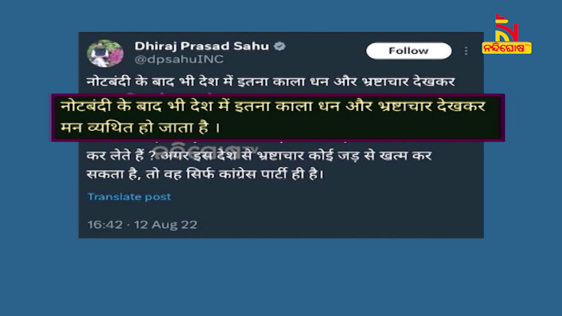 ଭୁବନେଶ୍ବର: ଝାରଖଣ୍ଡର କଂଗ୍ରେସ ରାଜ୍ୟସଭା ସାଂସଦ ଧୀରଜ ସାହୁଙ୍କ ଲିଙ୍କରେ ଆଇଟି ରେଡ ଜାରି ରହିଥିବା ବେଳେ ତାଙ୍କର ଏକ ଟୁଇଟ ଏବେ ଭାଇରାଲ ହେଉଛି । ୧୨ ଅଗଷ୍ଟ ୨୦୨୨ରେ ସେ ଏହି ଟୁଇଟ କରିଥିଲେ । ଧୀରଜ ସାହୁ ଲେଖିଥିଲେ ଯେ ବିମୁଦ୍ରୀକରଣ ପରେ ବି ଏତେ ମାତ୍ରାରେ କଳାଧନ ଦେଖି ମନ ବ୍ୟଥିତ ହେଉଛି । କିଛି ଜଣାପଡୁନି ଲୋକେ କେମିତି ଏତେ କଳାଧନ ଜମା କରୁଛନ୍ତି । ଦେଶରୁ କେହି ଯଦି ଭ୍ରଷ୍ଟାଚାର ହଟେଇପାରେ, ସେ ହେଉଛି ଏକ ମାତ୍ର କଂଗ୍ରେସ ଦଳ ବୋଲି ଧୀରଜ ସାହୁ ଟୁଇଟ କରିଥିଲେ । ଆଜି ତାଙ୍କ ପାଖରୁ ଶହ ଶହ କୋଟି ମିଳିବା ପରେ ଏହି ଟୁଇଟ ଏବେ ଭାଇରାଲ ହେଉଛି ।