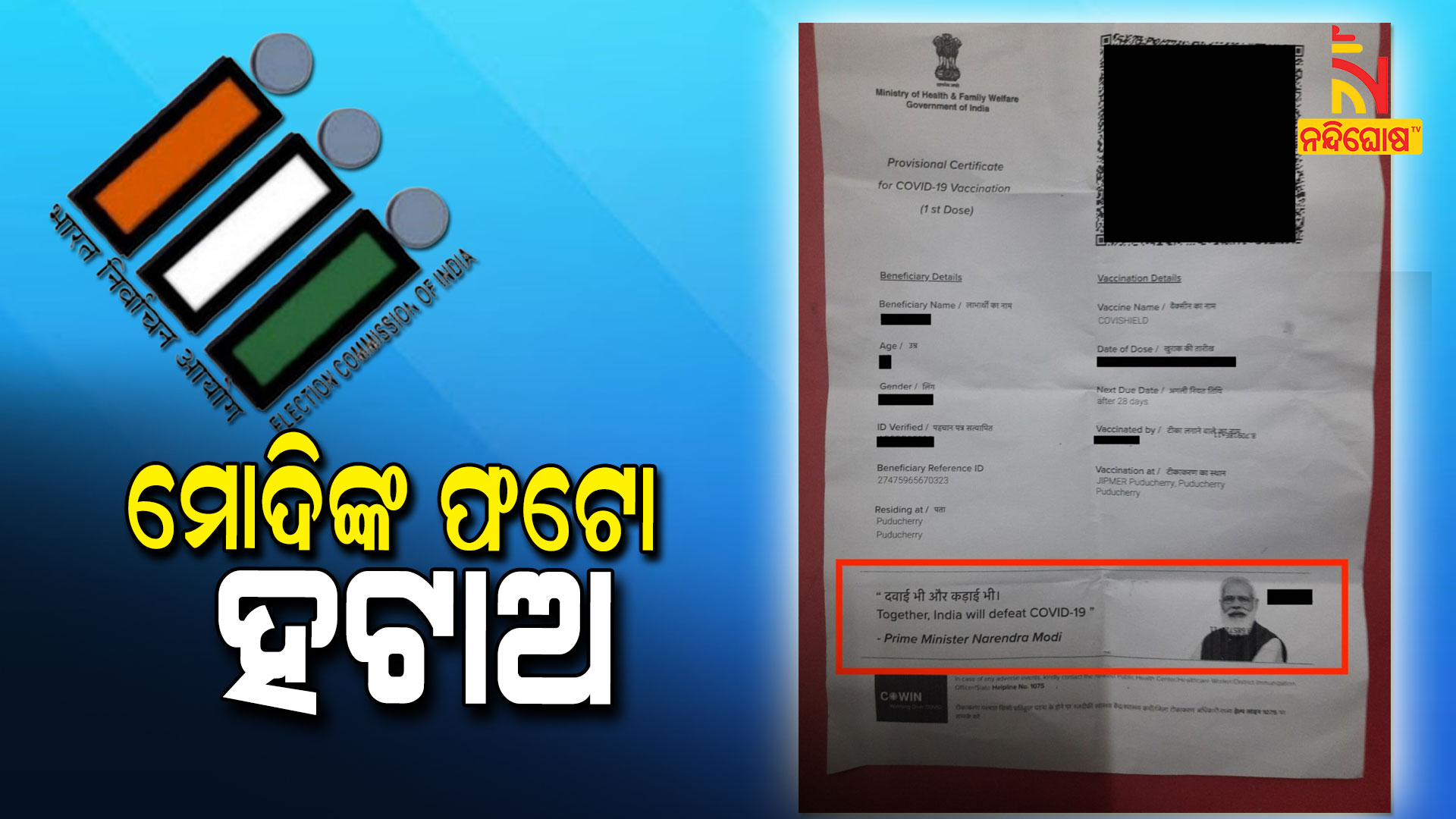 ସୂଚନା ଅନୁସାରେ ନିର୍ବାଚନ ହେବାକୁ ଥିବା ରାଜ୍ୟ ଓ କେନ୍ଦ୍ରଶାସିତ ଅଞ୍ଚଳ ଗୁଡିକରେ କରୋନା ଟିକାର ସାର୍ଟିଫିକେଟରୁ ପ୍ରଧାନମନ୍ତ୍ରୀଙ୍କ ଫଟୋ ହଟାଇବା ପାଇଁ ସ୍ୱାସ୍ଥ୍ୟ ମନ୍ତ୍ରଣାଳୟ ଓ କେନ୍ଦ୍ର ସରକାରଙ୍କୁ ନିର୍ଦ୍ଦେଶ ଦେଇଛନ୍ତି ମୁଖ୍ୟ ନିର୍ବାଚନ କମିଶନ ସୁନିଲ ଆରୋରା । ୭୨ ଘଣ୍ଟା ମଧ୍ୟରେ ଏହି ଆଦେଶ ପାଳନ ନେଇ ସ୍ପଷ୍ଟ କରିବାକୁ ନିର୍ବାଚନ କାର୍ଯ୍ୟରେ ନିୟୋଜିତ ଅଧିକାରୀ ମାନଙ୍କୁ କୁହାଯାଇଛି ।