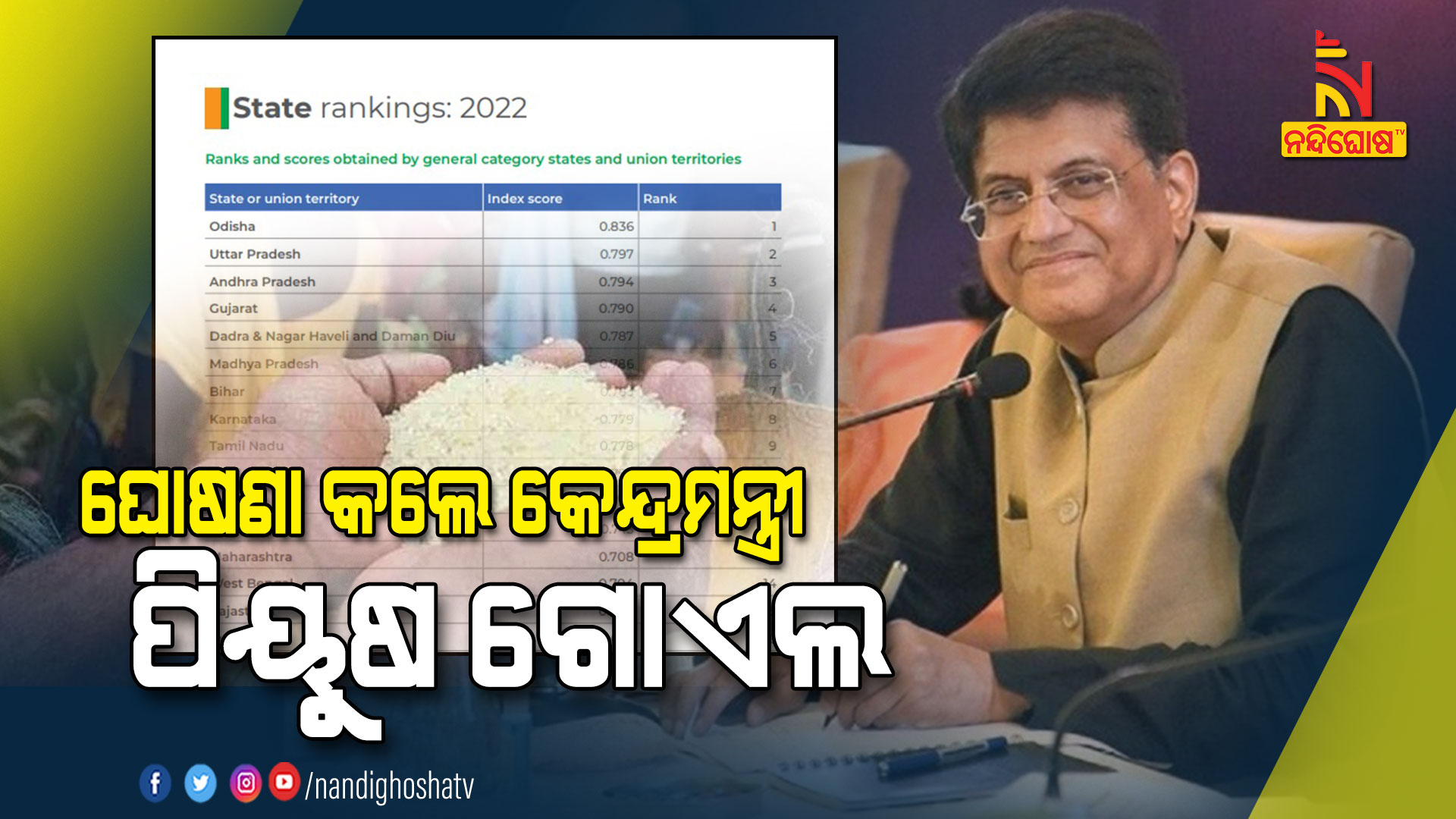 ନନ୍ଦିଘୋଷ ବ୍ୟୁରୋ: ପୁଣି ଓଡିଶାକୁ ଆଉ ଏକ ସଫଳତା  । ଖାଦ୍ୟ ଓ ପୋଷଣ ସୁରକ୍ଷାରେ ଓଡ଼ିଶା ଦେଶରେ ଶୀର୍ଷରେ ରହିଛି । ଦ୍ୱିତୀୟ ସ୍ଥାନରେ ରହିଛି ଉତ୍ତରପ୍ରଦେଶ । ଏନଏଫଏସଏର ଏହି ରାଙ୍କିଂରେ ଓଡ଼ିଶା ପୁଣି ପ୍ରଥମ ସ୍ଥାନ ଅଧିକାର କରିଛି । ଓଡିଶାର ଇଣ୍ଡେକ୍ସ ସ୍କୋର ୦.୮୩୬ ରହିଛି  । ଏନେଇ କେନ୍ଦ୍ରମନ୍ତ୍ରୀ ପୀୟୂଷ ଗୋଏଲ ଘୋଷଣା କରିଛନ୍ତି । ସାରା ଦେଶରେ ଓଡ଼ିଶା ପ୍ରଦର୍ଶନ ସବୁଠୁ ଭଲ  । ଉପଭୋକ୍ତା ବ୍ୟାପାର ଏବଂ ଖାଦ୍ୟ ଏବଂ ସର୍ବସାଧାରଣ ବିତରଣ ମନ୍ତ୍ରୀ ପିୟୁଷ ଗୋଏଲ ଏନେଇ ଆଜି ସୂଚନା ଦେଇଛନ୍ତି । ସେ ଟ୍ୱିଟ କରି କହିଛନ୍ତି, ଖାଦ୍ୟ ଏବଂ ପୋଷଣ ସୁରକ୍ଷା ଉପରେ ଆୟୋଜିତ ରାଷ୍ଟ୍ରୀୟ କନଫରେନ୍ସକୁ ସମ୍ବୋଧିତ କଲି ଏବଂ ପ୍ରଥମ ଥର ଏନଏଫଏସଏ ଆଧାରିତ ଷ୍ଟେଟ ରାଙ୍କିଂ ଜାରି କରିଛି, ଯେଉଁଥିରେ ଓଡିଶା ପ୍ରଥମ ସ୍ଥାନରେ ରହିଛି  । ସେହିପରି ଉତ୍ତରପ୍ରଦେଶ ଦ୍ୱିତୀୟ ସ୍ଥାନରେ ରହିଛି  । ସମସ୍ତ ରାଜ୍ୟକୁ ଦାୟିତ୍ୱର ସହ ଜନହିତକାରୀ ଯୋଜନା ଉପରେ କାମ କରିବା ପାଇଁ ପ୍ରୋତ୍ସାହିତ କଲି ।