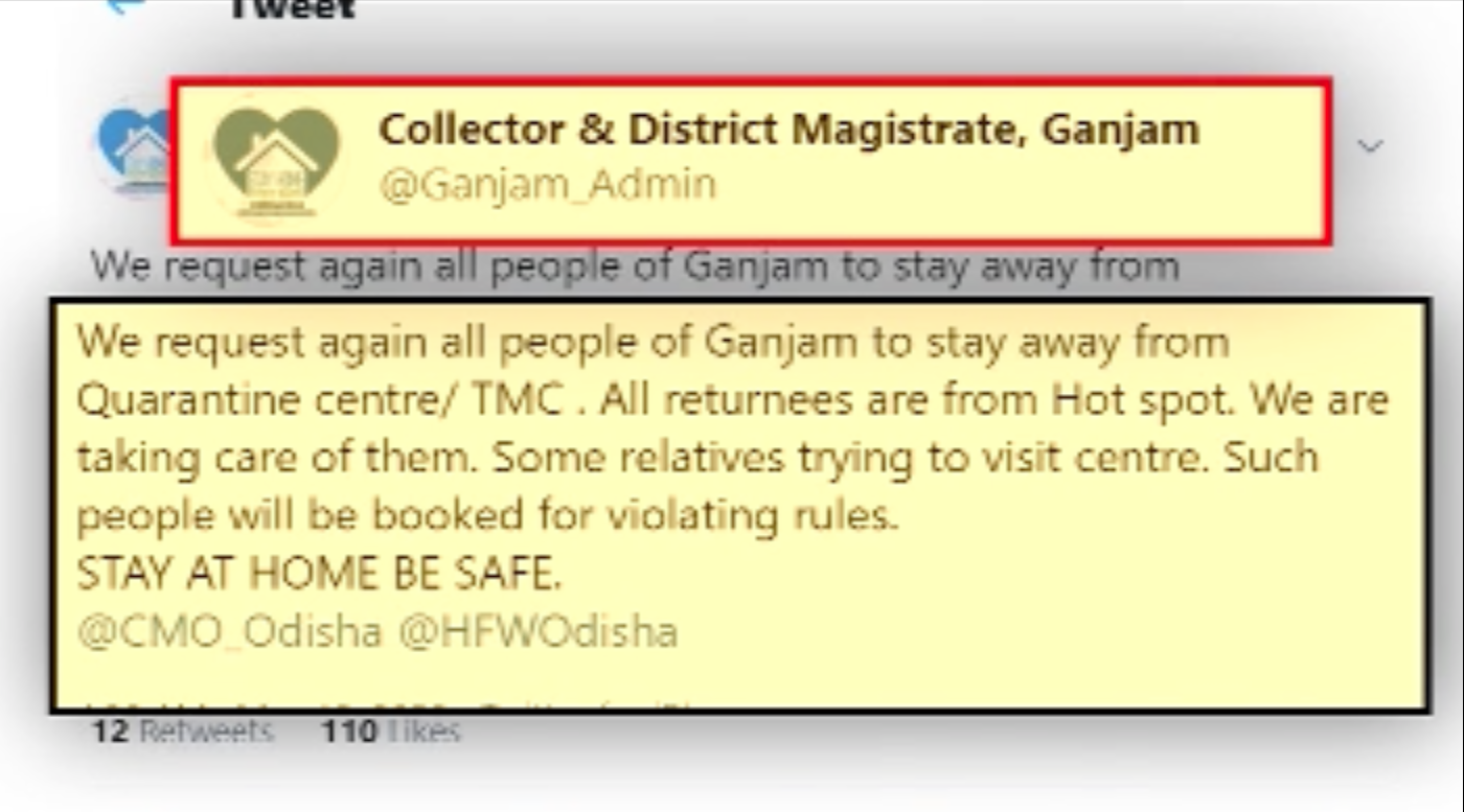 ଜିଲ୍ଲା ପ୍ରଶାସନ ପକ୍ଷରୁ କେନ୍ଦ୍ରରେ ଥିବା ଆକ୍ରାନ୍ତଙ୍କ ଉପଯୁକ୍ତ ଯତ୍ନ ନିଆଯାଉଛି । କିଛିଲୋକ ନିଜ ନିଜର ସଂପର୍କୀୟଙ୍କୁ ଭେଟିବା ସହ ବାହାରୁ ଖାଦ୍ୟ ଦେଉଛନ୍ତି । କ୍ୱାରେଣ୍ଟାଇନ କେନ୍ଦ୍ର ନିକଟକୁ ନ ଯିବା ଲାଗି ବାରଣ କରାଯାଇଛି । କୋଭିଡ ନିୟମକୁ ଉଲଘଂନ କଲେ ସେମାନଙ୍କ ବିରୋଧରେ ଦୃଢ କାର୍ଯ୍ୟାନୁଷ୍ଠାନ ନିଆଯିବ ବୋଲି ଚେତାବନୀ ଦେଇଛନ୍ତି ଜିଲ୍ଲାପାଳ । ଏ ନେଇ ଟୁଇଟ କରି ସୂଚନା ଦେଇଛନ୍ତି ଜିଲ୍ଲାପାଳ ବିଜୟ ଅମୃତ କୁଲାଙ୍ଗେ ।
