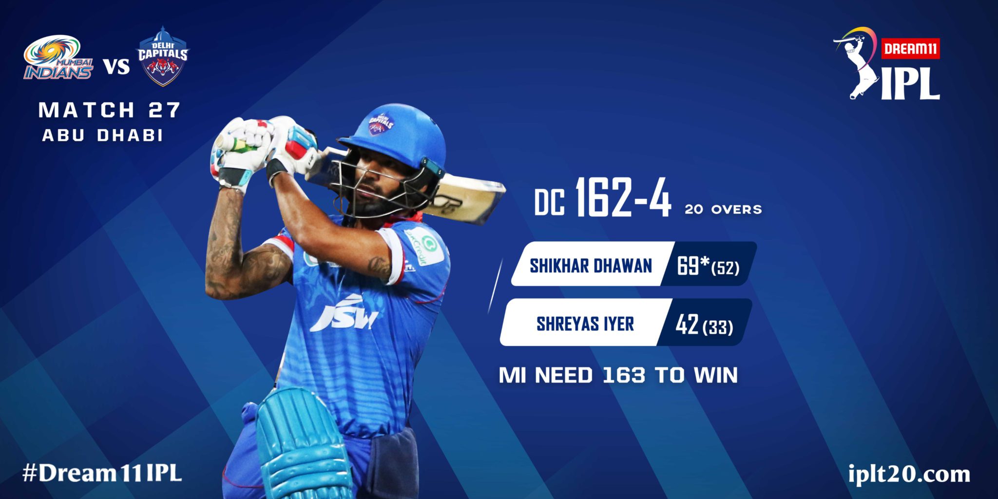 ଆବୁଧାବି : ଇଣ୍ଡିଆନ ପ୍ରିମିୟର ଲିଗ(ଆଇପିଏଲ)ରେ ରବିବାର ଖେଳାଯାଇଥିବା ଦ୍ୱିତୀୟ ମ୍ୟାଚରେ ମୁମ୍ବାଇ ଇଣ୍ଡିଆନ୍ସ ଏବଂ ଦିଲ୍ଲୀ କ୍ୟାପିଟାଲ୍ସ ପରସ୍ପରକୁ ଭେଟିଛନ୍ତି । ଏହି ମ୍ୟାଚରେ ପ୍ରଥମେ ବ୍ୟାଟିଂ କରିଥିଲା ଦିଲ୍ଲୀ କ୍ୟାପିଟାଲ୍ସ । ଦଳ ପକ୍ଷରୁ ନିର୍ଦ୍ଦାରିତ ୨୦ ଓଭରରେ ୪ ଉଇକେଟ ହରାଇ ୧୬୨ ରନ ସଂଗ୍ରହ କରିଛି । ଦଳ ପକ୍ଷରୁ ପୃଥ୍ବୀ ସ ମାତ୍ର ୪ ରନ କରି ଆଉଟ ହୋଇଯାଇଥିଲେ । ଓପନିଂ ଆସିଥିବା ଧାୱନ ଶେଷ ପର୍ଯ୍ୟନ୍ତ ଅପରାଜିତ ରହି ୬୯ ରନ୍ ସଂଗ୍ରହ କରିଥିଲେ । ସେ ୬ଟି ଚୌକା ଏବଂ ଗୋଟିଏ ଛକା ମାରିଥିଲେ । ସେହିପରି ରାହାନେ ୧୫, ଆୟାର ୪୨ ରନ ସଂଗ୍ରହ କରିଥିଲେ । ସେହିଭଳି ଷ୍ଟଏନିସ ୧୩ ଏବଂ କାରେ ୧୪ ରନ ସଂଗ୍ରହ କରିଥିଲେ ।