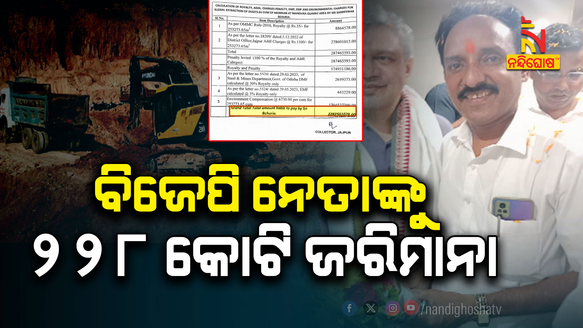 ଧର୍ମଶାଳା: ବେଆଇନ ମୋରମ ଚାଲାଣ ଅଭିଯୋଗରେ ବିଜେପି ନେତାଙ୍କୁ ଜୋରିମାନା। ଯାଜପୁର ଜିଲ୍ଲା ଧର୍ମଶାଳାର ବିଜେପି ନେତା ତଥା ସୂଚନା ଅଧିକାର କର୍ମୀ ସର୍ବେଶ୍ବର ବେହୁରାଙ୍କ ଉପରେ ୨୨୮ କୋଟିରୁ ଅଧିକ ଟଙ୍କା ଜୋରିମାନା କରିଛି ଜିଲ୍ଲା ପ୍ରଶାସନ। ଦର୍ପଣ ତହସିଲ ଅଧିନ ମାଣ୍ଡୁକା ପାହାଡ଼ରେ ବେଆଇନ ମୋରମ ଚାଲାଣ ହେଉଥିବାବେଳେ ଜିଲ୍ଲା ପ୍ରଶାସନ ରେଡ୍ କରିଥିଲା।