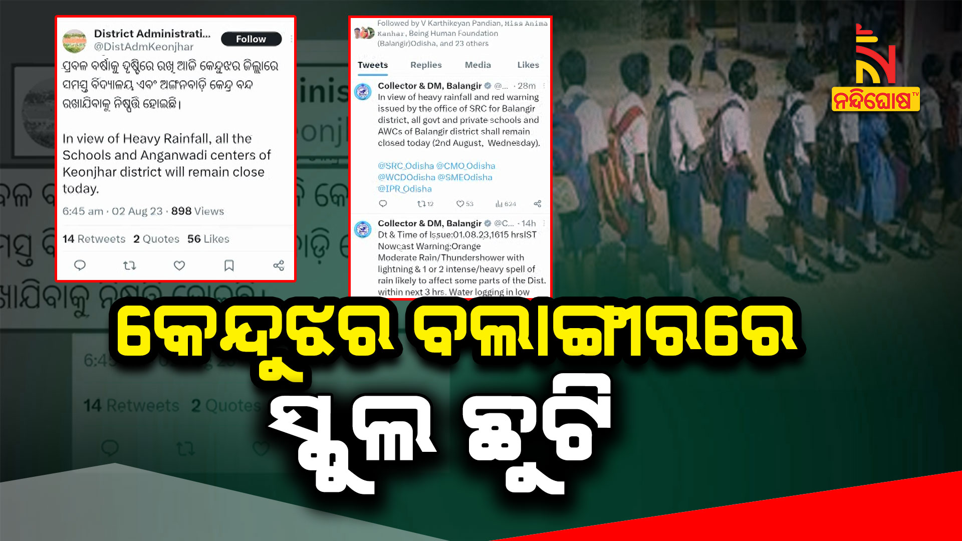 ସେହିପରି ପ୍ରବଳ ବର୍ଷା ଯୋଗୁ ବଲାଙ୍ଗୀର ଜିଲ୍ଲାର ସମସ୍ତ ସରକାରୀ ଓ ବେସରକାରୀ ସ୍କୁଲ, କଲେଜ, ଅଙ୍ଗନବାଡି କେନ୍ଦ୍ର ଛୁଟି ଘୋଷଣା । ଲଗାଣ ବର୍ଷା ପାଇଁ ଛୁଟି ଘୋଷଣା କଲେ ଜିଲ୍ଲାପାଳ ।