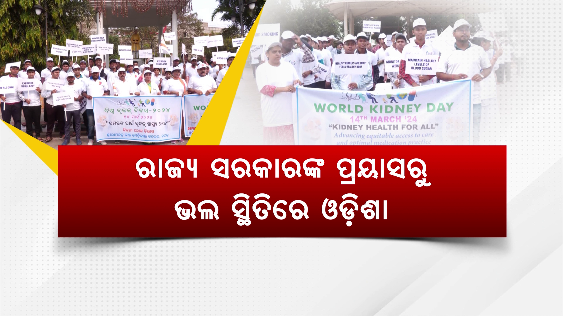 ସାରା ବିଶ୍ବରେ ବଢୁଛି କିଡନୀ ରୋଗୀ ସଂଖ୍ଯା । ଅସନ୍ତୁଳିତ ଖାଦ୍ଯ ଓ ଜୀବନଚର୍ଯ୍ଯା ବଢାଇଛି ସମସ୍ଯା । ରାଜ୍ଯ ସରକାରଙ୍କ ପ୍ରୟାସରୁ ଭଲ ସ୍ଥିତିରେ ଓଡ଼ିଶା । ସାରାବିଶ୍ୱ ପାଳୁଛି ବିଶ୍ୱ କିଡନୀ ଦିବସ । କଟକ ଏସସିବି ମେଡିକାଲ ବୃକକ ବିଭାଗ ପକ୍ଷରୁ ଏହି ଦିବସର ଅନୁଚିନ୍ତାକୁ ନେଇ ହୋଇଛି ସଚତେତନତା ପଦଯାତ୍ରା । ସୁସ୍ଥ କିଡନୀ ସମସ୍ତଙ୍କ ପାଇଁ ଜରୁରୀ । ଏହାର ସୁରକ୍ଷା ଓ ଯତ୍ନ ପାଇଁ ଶୃଙ୍ଖଳିତ ଜୀବନଚର୍ଯ୍ୟା ପାଳନ କରିବାକୁ ଆଜି ଦିନରେ ସମସ୍ତେ ସକଳ୍ପ ନେବା ଆବଶ୍ଯକ ବୋଲି ବିଶେଷଜ୍ଞ ମତ ଦେଇଛନ୍ତି ।