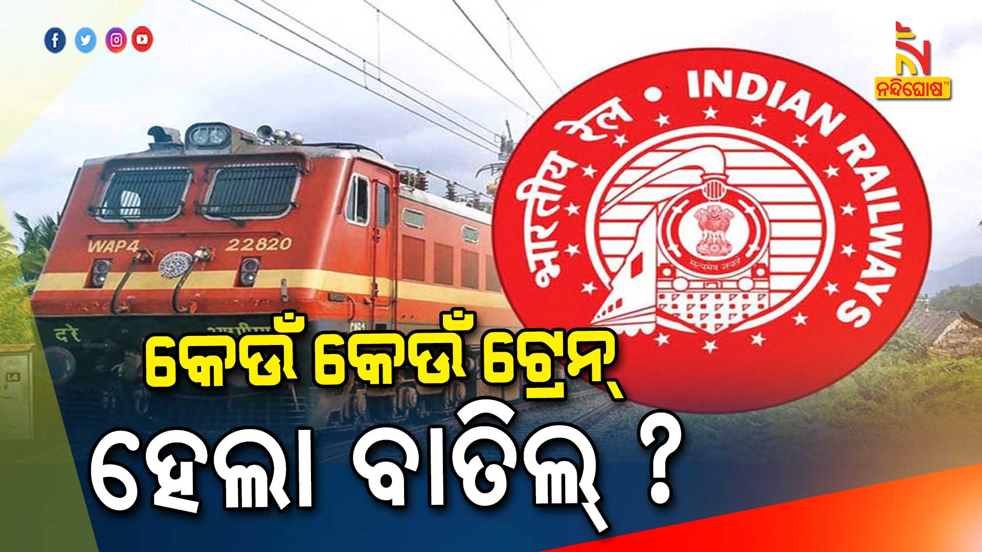 ବାତିଲ ହୋଇଥିବା ଟ୍ରେନ୍ ମଧ୍ୟରେ ହାୱାଡା –ଭୁବନେଶ୍ୱର ଜନଶତାବ୍ଦୀ ଏକ୍ସପ୍ରେସ, ଭୁବନେଶ୍ୱର-ବ୍ରହ୍ମପୁର-ଭୁବନେଶ୍ୱର ପାସେଞ୍ଜର ସ୍ପେଶାଲ ଏକ୍ସପ୍ରେସ, ହାୱାଡା-ପୁରୀ ଶତାବ୍ଦୀ ଏକ୍ସପ୍ରେସ,ହାୱାଡା-ଶାଲିମର ଏକ୍ସପ୍ରେସ,ଭୁବନେଶ୍ୱର-ବାଲେଶ୍ୱର ସ୍ପେଶାଲ ଏକ୍ସପ୍ରେସ,ପୁରୀ-ଶାଲିମାର ଏକ୍ସପ୍ରେସ୍,ଶାଲିମାର-ହାଇଦ୍ରାବାଦ ଏକ୍ସପ୍ରେସ,ପୁରୀ-ଶାଲିମାର ଏକ୍ସପ୍ରେସ, ଶାଲିମାର-ହାଇଦ୍ରାବାଦ ଏକ୍ସପ୍ରେସ,କଟକ-ଭଦ୍ରକ-କଟକ ପାସେଞ୍ଜର ଏକ୍ସପ୍ରେସ,କଟକ ଭଦ୍ରକ ପାସେଞ୍ଜର ସ୍ପେଶାଲସ, ଭୁବନେଶ୍ୱର-ବାଲେଶ୍ୱର ପାସେଞ୍ଜର ସ୍ପେଶାଲ