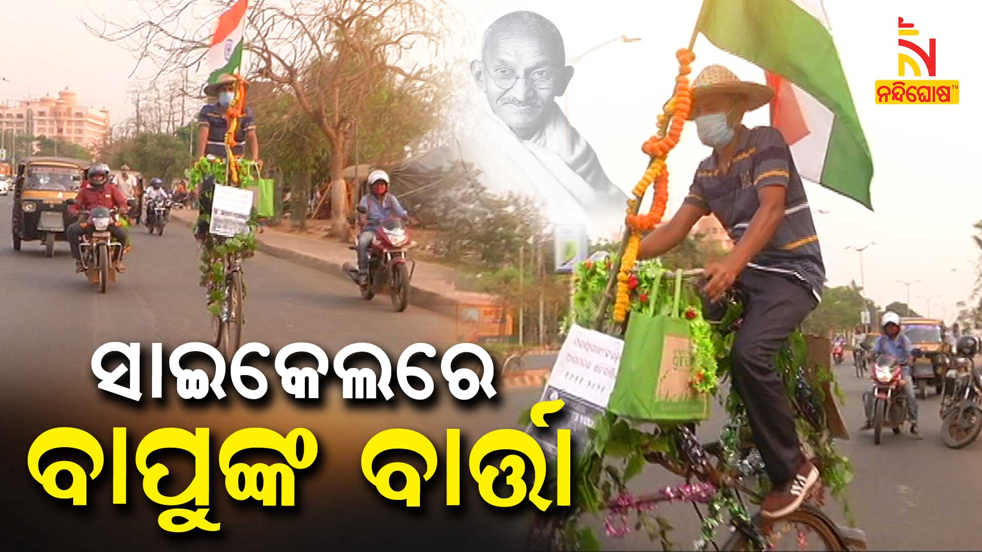 ଭୁବନେଶ୍ୱର: ମହାତ୍ମା ଗାନ୍ଧୀଙ୍କ ଓଡିଶା ଆଗମନକୁ ପୂରିଛି ୧୦୦ ବର୍ଷ । ଅତୀତର ସ୍ମୃତିକୁ ସାଉଁଟିଛି ଓଡିଶା । ରାଜ୍ୟର କୋଣ ଅନୁକୋଣରେ ଆୟୋଜିତ ହେଉଛି ଗାନ୍ଧୀ ସଭା । ଏହି ସମୟରେ ରାଜଧାନୀର ଜଣେ ଯୁବକ ନିଆରା ଢଙ୍ଗରେ ବାପୁଙ୍କୁ ମନେ ପକାଇଛନ୍ତି । ସ୍ୱତନ୍ତ୍ର ଡିଜାଇନର ସାଇକେଲ ଧରି ସହର ଗଲି କନ୍ଦି ବୁଲି ବାଣ୍ଟୁଛନ୍ତି ଶାନ୍ତି ଓ ସଦ୍‌ଭାବନାର ବାର୍ତ୍ତା ।