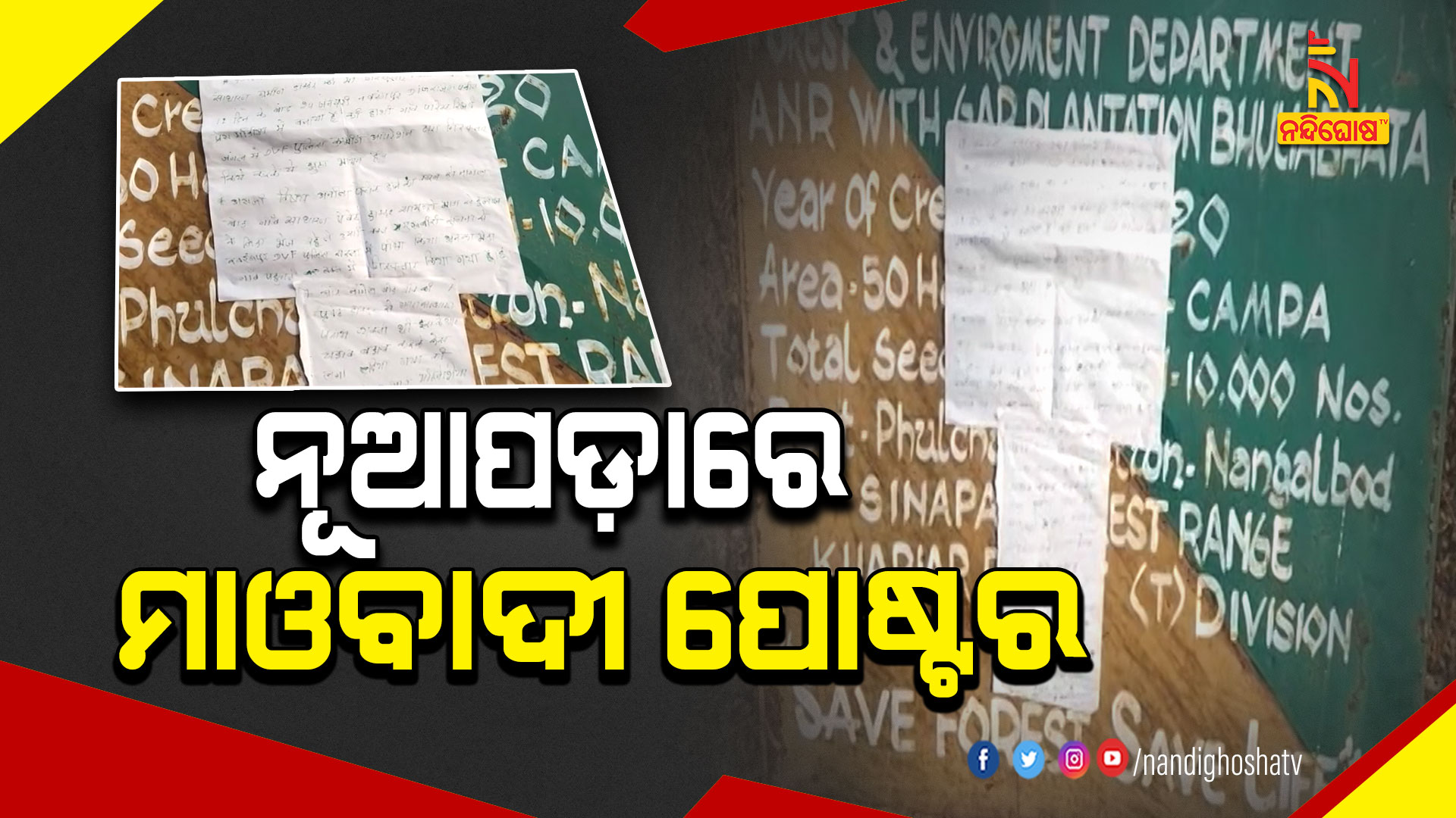 ନୂଆପଡ଼ା: ନୂଆପଡ଼ା ଜିଲ୍ଲା ସିନାପାଲି ଅଞ୍ଚଳରେ ମାଓ ପୋଷ୍ଟର l ଏଥିରେ ମୈନପୁର ନୂଆପଡ଼ା ମାଓ ଡିଭିଜନ କମିଟି ବୋଲି ଲେଖା ହୋଇଛି l ସିନାପାଲି ବ୍ଲକ ନଙ୍ଗଲବୋର୍ଡ ରାସ୍ତାକଡ଼ ଫରେଷ୍ଟ ବୋର୍ଡ ଏବଂ ପଞ୍ଚାୟତ କାର୍ଯ୍ୟାଳୟ ଗେଟରେ ଧଳା କାଗଜରେ ସବୁଜ ରଙ୍ଗରେ ଲେଖା ହୋଇଥିବା ପୋଷ୍ଟର ଲାଗିଛି l ଏହି ପୋଷ୍ଟର ମାଓ ସଂଗଠନର କି ନୁହେଁ, ଏନେଇ ତଦନ୍ତ ଚାଲିଥିବା ସିନାପାଲି ଆଇଆଇସି ଡମ୍ବରୁଧର ପ୍ରଧାନ କହିଛନ୍ତି । ପୋଷ୍ଟରରେ ଲେଖା ଅଛି ଯେ ଅଞ୍ଚଳର ସମୁଦ୍ର ବାଗ ଜଣେ ମାଓବାଦୀଙ୍କୁ ଚିକିତ୍ସା ପାଇଁ ନେଇ ଯାଉଥିଲେ l ସେହି ସମୟରେ ଦୁଇ ଜଣଙ୍କୁ ନବରଙ୍ଗପୁର ଡିଭିଏଫ ଗିରଫ କରିଥିଲା । ସମୁଦ୍ର ବାଗକୁ ପାର୍ଟି ମେମ୍ବର ଦର୍ଶାଇଥିଲା ପୋଲିସ l ହେଲେ ଏହାକୁ ମାଓବାଦୀମାନେ ପୋଷ୍ଟରରେ ଖଣ୍ଡନ କରିଛନ୍ତି l