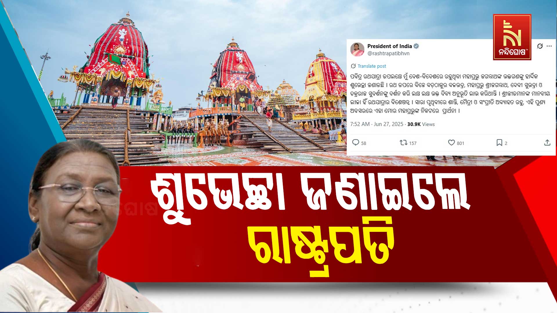 ନନ୍ଦିଘୋଷ ବ୍ୟୁରୋ : ପବିତ୍ର ରଥଯାତ୍ରା ଉପଲକ୍ଷେ ଶୁଭେଚ୍ଛା ଜଣାଇଲେ ରାଷ୍ଟ୍ରପତି ଦ୍ରୌପଦୀ ମୁର୍ମୁ । ସେ ଦେଶ-ବିଦେଶରେ ରହୁଥିବା ମହାପ୍ରଭୁ ଜଗନ୍ନାଥଙ୍କ ଭକ୍ତଗଣଙ୍କୁ ଶୁଭେଚ୍ଛା ଜଣାଇଛନ୍ତି । ଏହି ଅବସରରେ ରାଷ୍ଟ୍ରପତି କହିଛନ୍ତି, ରଥ ଉପରେ ବିଜେ ବଡ଼ଠାକୁର ବଳଭଦ୍ର, ମହାପ୍ରଭୁ ଶ୍ରୀଜଗନ୍ନାଥ, ଦେବୀ ସୁଭଦ୍ରା ଓ ଚକ୍ରରାଜ ସୁଦର୍ଶନଙ୍କୁ ଦର୍ଶନ କରି ଲକ୍ଷ ଲକ୍ଷ ଭକ୍ତ ଦିବ୍ୟ ଅନୁଭୂତି ଲାଭ କରିଥାନ୍ତି । ଶ୍ରୀଜୀଉମାନଙ୍କ ମାନବୀୟ ଲୀଳା ହିଁ ରଥଯାତ୍ରାର ବିଶେଷତ୍ୱ । ସାରା ପୃଥିବୀରେ ଶାନ୍ତି, ମୈତ୍ରୀ ଓ ସଂପ୍ରୀତି ଅବ୍ୟାହତ ରହୁ, ଏହି ପୁଣ୍ୟ ଅବସରରେ ଏହା ମୋର ମହାପ୍ରଭୁଙ୍କ ନିକଟରେ ପ୍ରାର୍ଥନା । ସେ ସୋସିଆଲ ମିଡିଆ Xରେ ଟ୍ୱିଟ୍ କରି ଦେଶବାସୀଙ୍କୁ ଶୁଭେଚ୍ଛା ଜଣାଇଛନ୍ତି ।