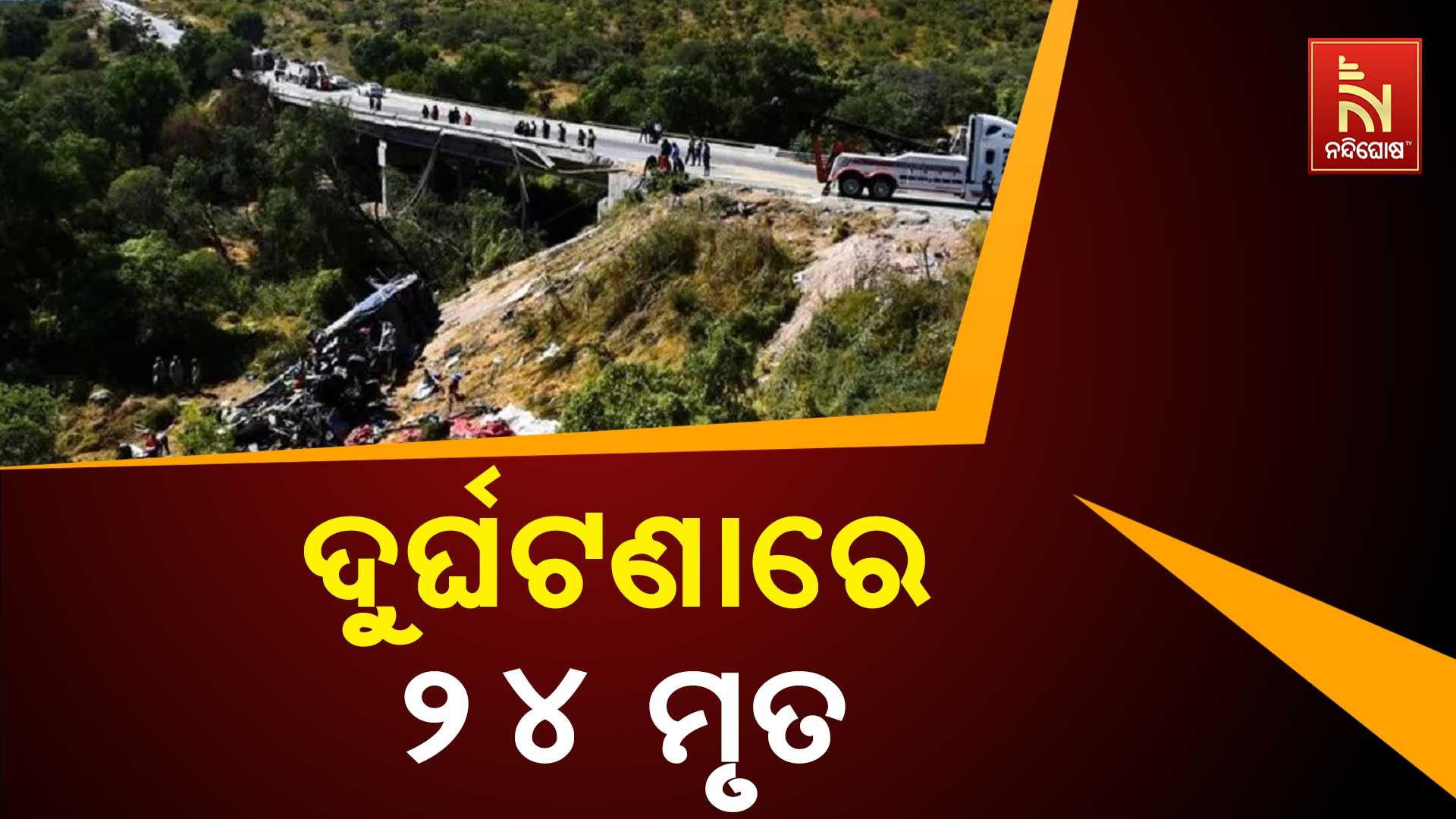ମେକ୍ସିକୋ : ମେକ୍ସିକୋ ମର୍ମନ୍ତୁଦ ସଡ଼କ ଦୁର୍ଘଟଣା । ମେକ୍ସିକୋ କେନ୍ଦ୍ରୀୟ ରାଜମାର୍ଗରେ ଏହି ଦୁର୍ଘଟଣା ଘଟିଛି । ଟ୍ରାକ୍ଟର-ଟ୍ରଲି ସହ ଯାତ୍ରୀବାହୀ ବସ୍ ଧକ୍କା ହୋଇଥିଲା । ଫଳରେ ଉଭୟ ଗାଡି ଖାଲରେ ପଡିଯାଇଥିଲା । ଫଲରେ ପ୍ରାୟ ୨୪ଜଣଙ୍କ ମୃତ୍ୟୁ ହୋଇଥିବା ବେଳେ ୫ଜଣ ଗୁରୁତର ଭାବେ ଆହତ ହୋଇଛନ୍ତି । ଆହତ ମାନଙ୍କୁ ଉଦ୍ଧାର କରି ନିକଟସ୍ଥ ହସ୍ପିଟାଲରେ ଭର୍ତ୍ତି କରାଯାଇଛି । ଜକାଟେକସ୍ ଗଭର୍ଣ୍ଣରଙ୍କ ସୂଚନା ମୁତାବତ, ଶନିବାର ଏହି ଦୁର୍ଘଟଣା ଘଟିଛି । ମେକ୍ସିକୋର କେନ୍ଦ୍ରୀୟ ଜାତୀୟ ରାଜପଥରେ ଏକ ଯାତ୍ରୀବାହୀ ବସକୁ ମକ୍କା ଭର୍ତ୍ତି ଟ୍ରାକ୍ଟର ପଛକୁ ଧକା ଦେଇଥିଲା । ଖବର ପାଇ ରେସକ୍ୟୁ ଟିମ୍ ଘଟଣାସ୍ଥଳରେ ପହଞ୍ଚି ୫ଗୁରୁତରଙ୍କ ଉଦ୍ଧାର କରି ହସ୍ପିଟାଲରେ ଭର୍ତ୍ତି କରିଛନ୍ତି । ଏହି ଘଟଣାରେ ମୋଟ୍ ୨୪ଜଣଙ୍କ ମୃତ୍ୟୁ ହୋଇଛି । ଡାକ୍ତରଖାନାରେ ଚିକିତ୍ସିତ ହେଉଥିବା ଆହତମାନଙ୍କ ଅବସ୍ଥା ସଙ୍କଟାପନ୍ନ ରହିଛି । ଏହି ବସ୍ ଆମେରିକା-ମେକ୍ସିକୋ ସୀମାରେ ଥିବା ଚିହୁଆହୁଆ ରାଜ୍ୟର ସିୟୁଡାଡ ଜୁଆରେଜକୁ ଯାଉଥିଲା। ଏହି ଦୁର୍ଘଟଣାରେ ପ୍ରାଣ ହରାଇଥିବା ଲୋକମାନେ ମେକ୍ସିକୋର ବାସିନ୍ଦା ଥିଲେ।