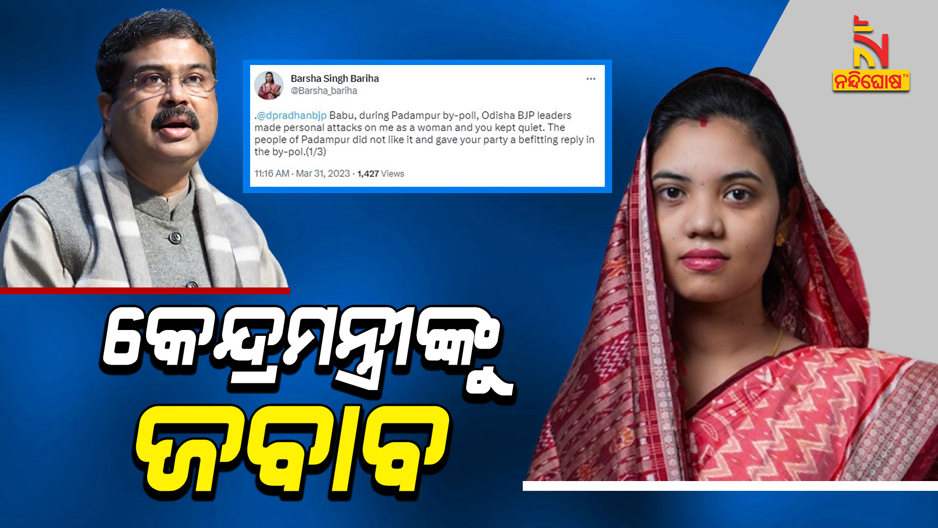 ପଦମପୁର ଉପନିର୍ବାଚନ ବେଳେ ଜଣେ ମହିଳା ପ୍ରାର୍ଥୀଙ୍କୁ ବିଜେପି ଦଳ ଯେଉଁଭଳି ବ୍ୟକ୍ତିଗତ ଆକ୍ଷେପ କରୁଥିଲେ ଓ ଧର୍ମେନ୍ଦ୍ର ସେତେବେଳେ ନୀରବଦ୍ରଷ୍ଟା ସାଜିଥିଲେ ତାହା ମନେ ପକାଇଦେଇଛନ୍ତି ବର୍ଷା । ବର୍ଷା ଟୁଇଟରେ କହିଛନ୍ତି, ପଦମପୁର ନିର୍ବାଚନବେଳେ ବ୍ୟକ୍ତିଗତ ଭାବେ ତାଙ୍କୁ କେନ୍ଦ୍ରମନ୍ତ୍ରୀ ଆକ୍ରମଣ କରିଥିଲେ । ପଦମପୁରବାସୀ ଏହାକୁ ପସନ୍ଦ କରିନଥିଲେ । ଜବାବରେ ବିଜେପିକୁ ପଦମପୁରବାସୀ ଜବାବ ଦେଇଥିଲେ ବୋଲି କହିଛନ୍ତି ବର୍ଷା ।