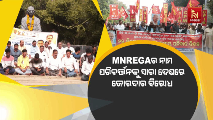 ନନ୍ଦିଘୋଷ ବ୍ୟୁରୋ: ମହାତ୍ମାଗାନ୍ଧୀ ନିଶ୍ଚିନ୍ତ କର୍ମ ନିଯୁକ୍ତି ଯୋଜନା ବା ମନରେଗା ନାମକରଣ ବଦଳାଇବା ଓ ଯୋଜନାର ରୂପରେଖ ବିକୃତ କରିବା ପ୍ରତିବାଦରେ ସାରା ଦେଶରେ ପ୍ରତିବାଦ ଜୋର ଧରିଛି । ଭୁବନେଶ୍ବର ଓ କଟକରେ ବିଭିନ୍ନ ଦଳ ପକ୍ଷରୁ ଜୋରଦାର ପ୍ରତିବାଦ ଦେଖିବାକୁ ମିଳିଛି । ରାଜାରସ୍ତାରେ ୪ ବାମପନ୍ଥୀ ଦଳ ବିକ୍ଷୋଭ ଓ ପ୍ରତିବାଦ ସଭା କରିଥିବା ବେଳେ ମହାତ୍ମା ଗାନ୍ଧୀଙ୍କ ପ୍ରତିମୂତ୍ତି ତଳେ ଧାରଣା ଦେଇ ବିକ୍ଷୋଭ କରିଛି କଂଗ୍ରେସ ।