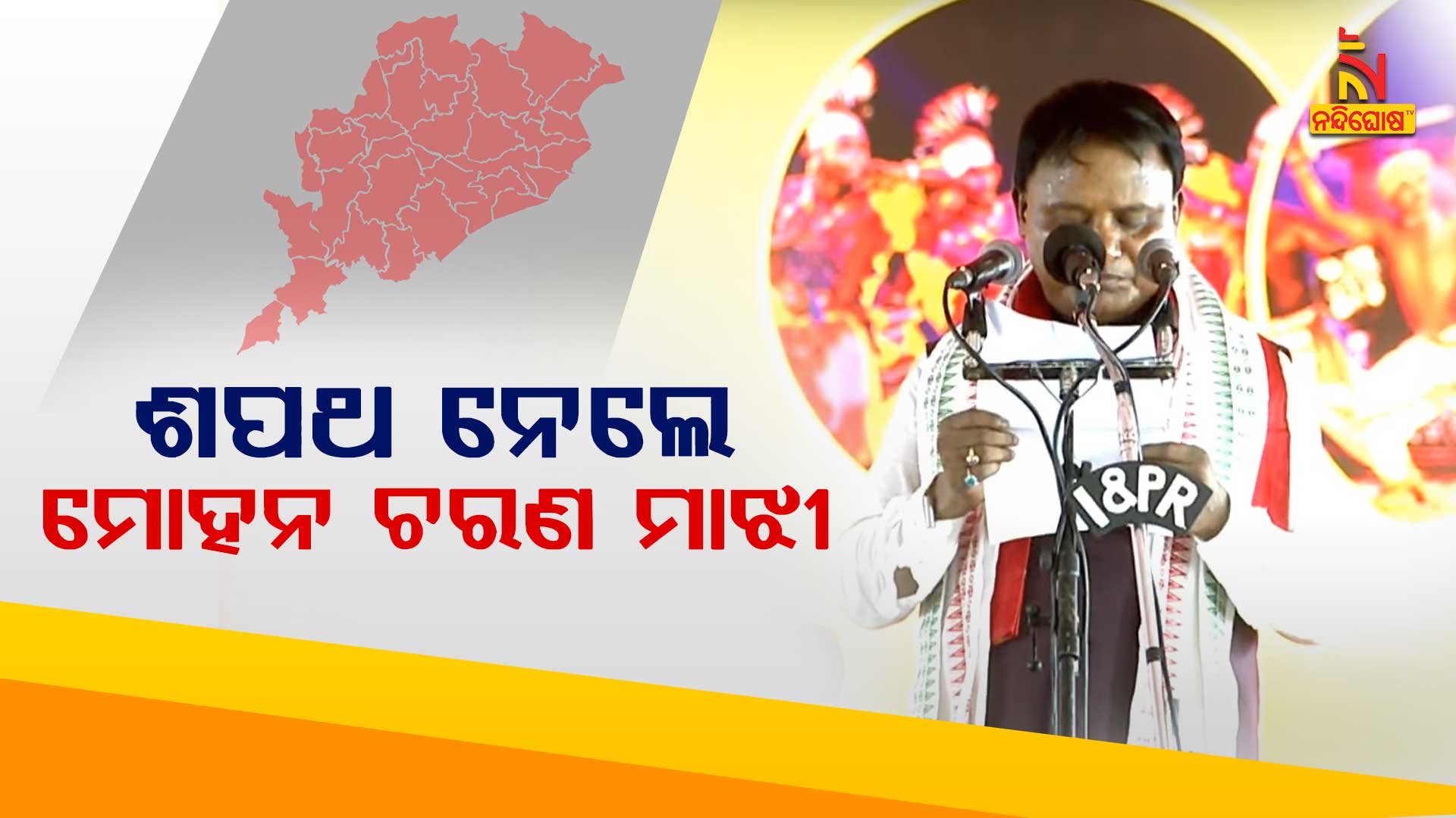 ଭୁବନେଶ୍ୱର : ଓଡ଼ିଶାର ନୂଆ ମୁଖ୍ୟମନ୍ତ୍ରୀ ଭାବେ ମୋହନ ଚରଣ ମାଝି ବୁଧବାର ଦିନ ଶପଥ ଗ୍ରହଣ କରିଛନ୍ତି । ଭୁବନେଶ୍ୱରର ଜନତା ମୈଦାନର ଆୟୋଜିତ ବର୍ଣ୍ଣାଢ୍ୟ ସମାରୋହରେ ରାଜ୍ୟପାଳ ରଘୁବର ଦାସ ତାଙ୍କ ଶପଥ ପାଠ କରାଇଥିଲେ । ଶପଥ ଗ୍ରହଣ ସମାରୋହରେ ପ୍ରଧାନମନ୍ତ୍ରୀ ନରେନ୍ଦ୍ର ମୋଦିଙ୍କ ସମେତେ କେନ୍ଦ୍ର ଗୃହମନ୍ତ୍ରୀ ଅମିତ ଶାହ,ପ୍ରତିରକ୍ଷା ମନ୍ତ୍ରୀ ରାଜନାଥ ସିଂହ ଉପସ୍ଥିତ ଥିଲେ । ଏହା ସହିତ ପୂର୍ବତନ ମୁଖ୍ୟମନ୍ତ୍ରୀ ନବୀନ ପଟ୍ଟନାୟକ ମଧ୍ୟ ମଞ୍ଚରେ ଉପସ୍ଥିତ ଥିଲେ ।