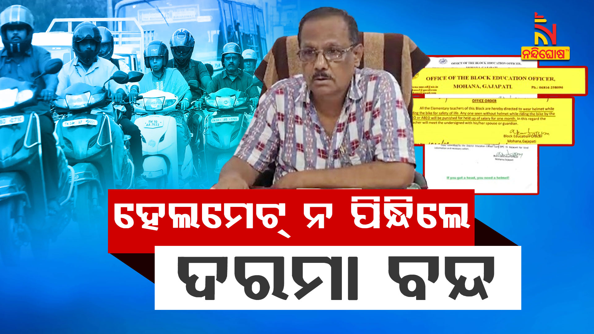 ଗଜପତି: ଶିକ୍ଷକଙ୍କୁ ମୋହନା ବିଇଓଙ୍କ କଡ଼ା ତାଗିଦ। ଗାଡ଼ି ଚଳାଇବା ବେଳେ ହେଲମେଟ ନପିନ୍ଧିଲେ ହେବ କାର୍ଯ୍ୟାନୁଷ୍ଠାନ। ବନ୍ଦ ହେବ ଦରମା। ଏଭଳି ନିଆରା ପଦକ୍ଷେପ ନେଇଛନ୍ତି ଗଜପତି ଜିଲ୍ଲା ମୋହନା ବ୍ଳକ ଶିକ୍ଷାଧିକାରୀ ନରେନ୍ଦ୍ର ବେହେରା । ବାଇକରେ ବିଦ୍ୟାଳୟ ଯିବା ସମୟରେ ହେଉ କିମ୍ବା ଅନ୍ୟ ସବୁବେଳେ ହେଲମେଟ ପିନ୍ଧିବାକୁ ତାଗିଦ କରିଛନ୍ତି ବିଇଓ। ଏନେଇ ମୋହନା ବ୍ଲକରେ କାର୍ଯ୍ୟରତ ସମସ୍ତ ଶିକ୍ଷକ ଶିକ୍ଷୟିତ୍ରୀଙ୍କୁ ଜଣାଇବା ସହ ସମସ୍ତ ବିଦ୍ୟାଳୟର ପ୍ରଧାନ ଶିକ୍ଷକ, ସିଆରସିସିଙ୍କୁ ନିୟମ ପାଳନ କରିବାକୁ ନିର୍ଦ୍ଦେଶ ଦେଇଛନ୍ତି l ଏଥିସହ ଡିଇଓଙ୍କୁ ଚିଠି ଲେଖି ଅବଗତ କରାଇଛନ୍ତି ବ୍ଲକ ଶିକ୍ଷା ଅଧିକାରୀ। ଯଦି କୌଣସି ଶିକ୍ଷକ, ଶିକ୍ଷୟିତ୍ରୀ ଏହି ନିର୍ଦ୍ଦେଶକୁ ଅବମାନନା କରି ବିନା ହେଲମେଟରେ ବାଇକ ଚଳାଇବାର ନଜରକୁ ଆସନ୍ତି ତେବେ ତାଙ୍କ ବିରୋଧରେ କଡା କାର୍ଯ୍ୟାନୁଷ୍ଠାନ ନିଆଯିବ। ସମ୍ପୃକ୍ତ ଶିକ୍ଷକଙ୍କ ଗୋଟିଏ ମାସର ଦରମା ବନ୍ଦ ପାଇଁ ପଦକ୍ଷେପ ନିଆଯିବ ।