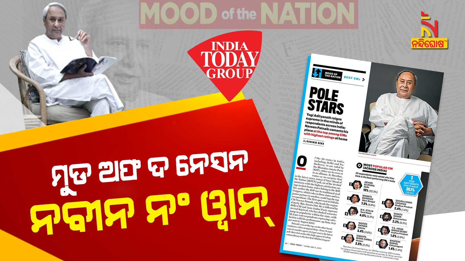 ମାଗାଜିନ୍ ‘ଇଣ୍ଡିଆ ଟୁଡେ’ ର ‘ମୁଡ୍ ଅଫ ଦ ନେସନ’ ପୋଲରେ ନବୀନଙ୍କୁ ଅଧିକ ରେଟିଂ ମିଳିଛି । ସେ ୭୩.୨% ଲୋକଙ୍କ ମନ ଜିତି ସର୍ବାଧିକ ଲୋକପ୍ରିୟ ମୁଖ୍ୟମନ୍ତ୍ରୀ ତାଲିକାର ଶୀର୍ଷରେ ଅଛନ୍ତି । ତାଙ୍କ ପଛକୁ ଅଛନ୍ତି ଦିଲ୍ଲୀ ମୁଖ୍ୟମନ୍ତ୍ରୀ ଅରବିନ୍ଦ କେଜ୍ରିଓ୍ବାଲ (୬୯.୨%) । ଆସାମ ମୁଖ୍ୟମନ୍ତ୍ରୀ ହିମନ୍ତ ବିଶ୍ବଶର୍ମା (୬୮.୩%) ରେଟିଂ ପାଇ ତୃତୀୟ ସ୍ଥାନରେ ଅଛନ୍ତି । ଟପ ଟେନ ଲୋକପ୍ରିୟ ମୁଖ୍ୟମନ୍ତ୍ରୀ ତାଲିକାରେ ଯଥାକ୍ରମେ ଅଛନ୍ତି ଭୂପେଶ ବାଘେଲ (ଛତିଶଗଡ଼), ଶିବରାଜ ସିଂହ ଚୌହ୍ବାନ (ମଧ୍ୟପ୍ରଦେଶ), ପୁଷ୍କର ଧାମୀ (ଉତ୍ତରାଖଣ୍ଡ), ଯୋଗୀ ଆଦିତ୍ୟନାଥ (ଉତ୍ତରପ୍ରଦେଶ), ଏମ କେ ଷ୍ଟାଲିନ (ତାମିଲନାଡୁ), ଭୁପେନ୍ଦ୍ର ପଟେଲ (ଗୁଜୁରାଟ) ଓ ଜଗନ ମୋହନ ରେଡ୍ଡି (ଆନ୍ଧ୍ରପ୍ରଦେଶ) ।