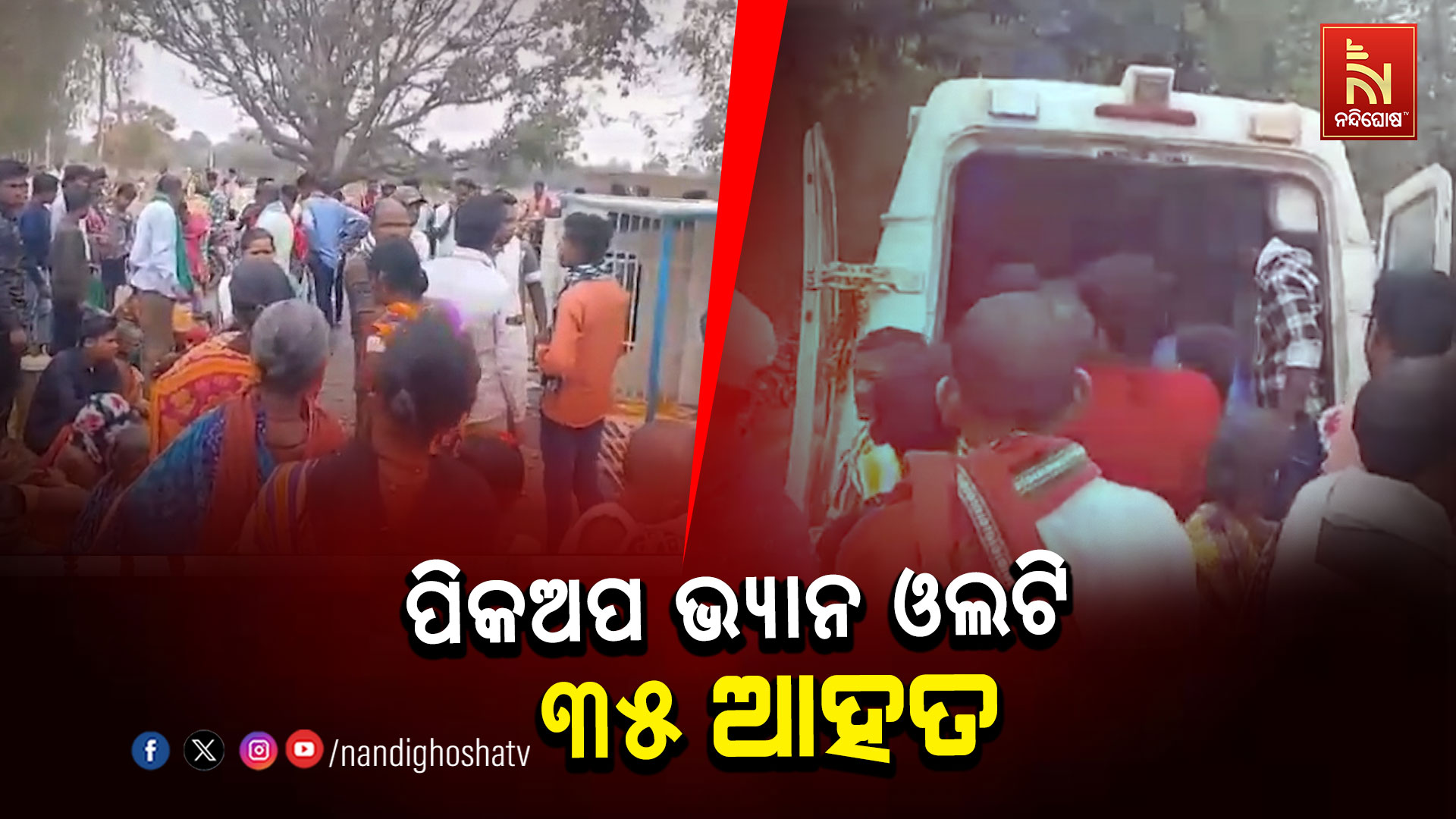 ନନ୍ଦିଘୋଷ ବ୍ୟୁରୋ: ପିକଅପ ଭ୍ୟାନ ଓଲଟି ୩୫ ଜଣ ଆହତ। ଝିଅ ନିର୍ବନ୍ଧ କରିବାକୁ ଯାଇଥିବାବେଳେ ଘଟିଲା ଅଘଟଣ। ନବରଙ୍ଗପୁର ଜିଲ୍ଲା ଝରିଗାଁ ବ୍ଲକ ଏକମ୍ବା ଗାଁରୁ ଝିଅ ନିର୍ବନ୍ଧ କରିବାକୁ ବାହାରିଥିଲେ। ମୋହଣ୍ଡି ନିକଟରେ ପିକଅପ ଗାଡ଼ିଟି ଭାରସାମ୍ୟ ହରାଇ ରାସ୍ତା କଡ଼କୁ ଓଲଟି ପଡିଥିଲା। ଘଟଣାସ୍ଥଳରୁ ଗାଡ଼ି ଚାଳକ ଫେରାର ହୋଇଯାଇଥିବା ଜଣାପଡ଼ିଛି। ସୂଚନା ଅନୁଯାଇ ପ୍ରାୟ ୩୦ରୁ ୩୫ ଜଣ ମହିଳା ଓ ପୁରୁଷ ଏକ ମହିନ୍ଦ୍ରା ମିନି ପିକ ଅପ ଗାଡିରେ ଏକ ନିର୍ବନ୍ଧ କାର୍ଯ୍ୟକ୍ରମରେ ଯୋଗଦେବାକୁ ଯାଉଥିଲେ। ହେଲେ ବାଟରେ ଗାଡ଼ିଟି ଭାରସାମ୍ୟ ହରାଇ ଓଲଟି ପଡିଥିଲା ।ସ୍ଥାନୀୟ ଲୋକେ ଆମ୍ବୁଲାନ୍ସ କୁ ଫୋନ କରି ସମସ୍ତ ଆହତଙ୍କୁ ଉମରକୋଟ ଓ ଝରିଗାଁ ଗୋଷ୍ଠୀ ସ୍ୱାସ୍ଥ୍ୟ କେନ୍ଦ୍ର କୁ ପଠାଇଥିଲେ । ଆହତ ହୋଇଥିବା ଲୋକଙ୍କ ପ୍ରାଥମିକ ଚିକିତ୍ସା ଜାରି ରହିଛି । ସେମାନଙ୍କ ମଧ୍ୟରୁ ଦୁଇ ଜଣଙ୍କ ଅବସ୍ଥା ଗୁରୁତର ଥିବାରୁ ଉଭୟଙ୍କୁ ଜିଲ୍ଲା ମୁଖ୍ୟ ଚିକିତ୍ସାଳୟକୁ ସ୍ଥାନାନ୍ତର କରାଯାଇଥିବା ସୂଚନା ମିଳିଛି । ଡ଼୍ରାଇଭରଙ୍କ ବେପରୁଆ ମନୋଭାବ ଯୋଗୁଁ ଦୁର୍ଘଟଣା ଘଟିଥିବା ଅଭିଯୋଗ ହୋଇଛି।