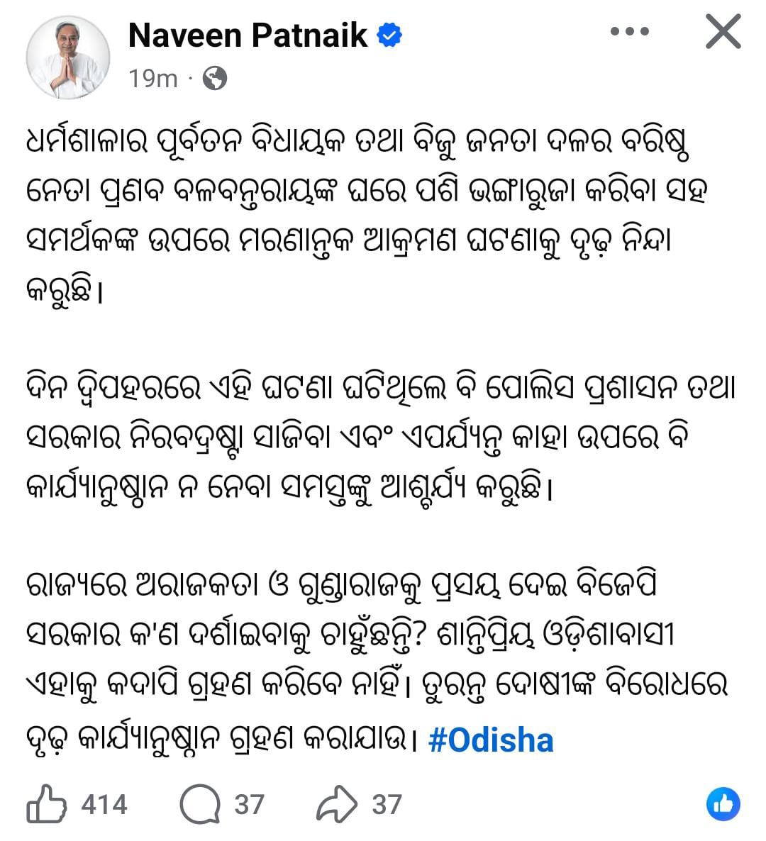 ଭୁବନେଶ୍ବର : ଯାଜପୁର ଧର୍ମଶାଳାର ପୂର୍ବତନ ବିଧାୟକ ତଥା ବିଜୁ ଜନତା ଦଳର ବରିଷ୍ଠ ନେତା ପ୍ରଣବ ବଳବନ୍ତରାୟଙ୍କ ଘରେ ପଶି ଭଙ୍ଗା ରୁଜା ଓ ସମର୍ଥକଙ୍କ ଉପରେ ଆକ୍ରମଣ ଘଟଣାକୁ ଦୃଢ଼ ନିନ୍ଦା କରିଛନ୍ତି ବିଜେଡି ମୁଖ୍ୟ ନବୀନ ପଟ୍ଟନାୟକ। ସୋସିଆଲ ମିଡିଆରେ ସେ ପୋଷ୍ଟ କରିଛନ୍ତି, ଦିନ ଦ୍ବିପହରରେ ଏହି ଘଟଣା ଘଟିଥିଲେ ବି ପୋଲିସ ପ୍ରଶାସନ ତଥା ସରକାର ନିରବଦ୍ରଷ୍ଟା ସାଜିବା ଏବଂ ଏପର୍ଯ୍ୟନ୍ତ କାହା ଉପରେ ବି କାର୍ଯ୍ୟାନୁଷ୍ଠାନ ନ ନେବା ସମସ୍ତଙ୍କୁ ଆଶ୍ଚର୍ଯ୍ୟ କରୁଛି। ରାଜ୍ୟରେ ଅରାଜକତା ଓ ଗୁଣ୍ଡାରାଜକୁ ପ୍ରସୟ ଦେଇ ବିଜେପି ସରକାର କ’ଣ ଦର୍ଶାଇବାକୁ ଚାହୁଁଛନ୍ତି? ଶାନ୍ତିପ୍ରିୟ ଓଡ଼ିଶାବାସୀ ଏହାକୁ କଦାପି ଗ୍ରହଣ କରିବେ ନାହିଁ। ତୁରନ୍ତ ଦୋଷୀଙ୍କ ବିରୋଧରେ ଦୃଢ଼ କାର୍ଯ୍ୟାନୁଷ୍ଠାନ ଗ୍ରହଣ କରାଯାଉ ବୋଲି ଦାବି କରିଛନ୍ତି ନବୀନ ପଟ୍ଟନାୟକ।