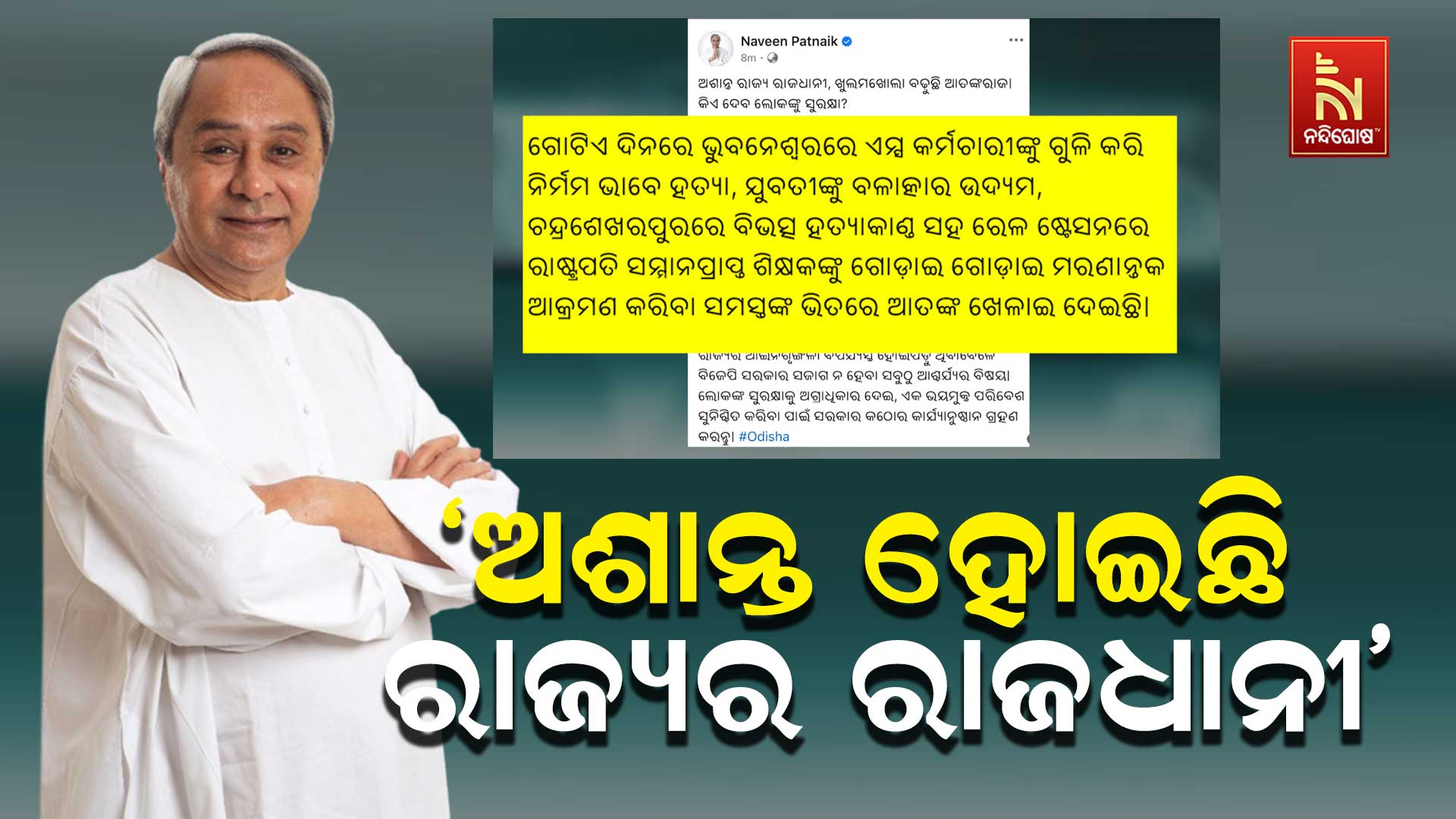ନନ୍ଦିଘୋଷ ବ୍ୟୁରୋ: ରାଜ୍ୟର ବିପର୍ଯ୍ୟସ୍ତ ଆଇନ ଶୃଙ୍ଖଳା ନେଇ ଉଦବେଗ ପ୍ରକାଶ କରି ରାଜ୍ୟ ସରକାରଙ୍କ ଉପରେ ବର୍ଷିଛନ୍ତି ବିରୋଧୀ ଦଳ ନେତା ନବୀନ ପଟ୍ଟନାୟକ । ସୋସିଆଲ ମିଡିଆରେ ପୋଷ୍ଟ କରି ଲେଖିଛନ୍ତି, ଅଶାନ୍ତ ହୋଇଛି ରାଜ୍ୟର ରାଜଧାନୀ । ଖୁଲମଖୋଲା ବଢ଼ୁଛି ଆତଙ୍କରାଜ । କିଏ ଦେବ ଲୋକଙ୍କୁ ସୁରକ୍ଷା ?