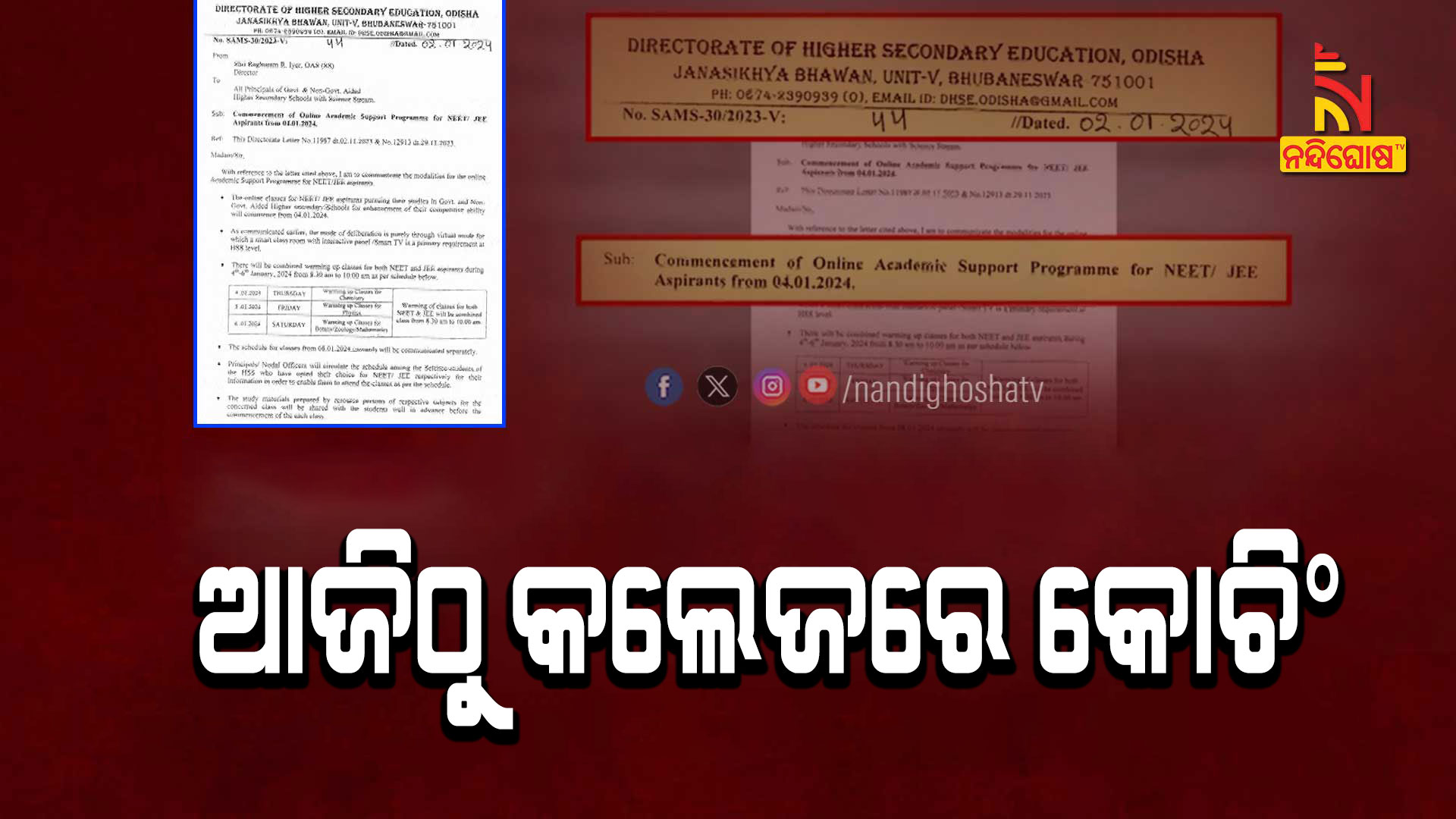ସର୍ବଭାରତୀୟ ମେଡିକାଲ ପ୍ରବେଶିକା ପରୀକ୍ଷା, neet ଓ ଇଞ୍ଜିନିୟରିଂ ପ୍ରବେଶିକା ପରୀକ୍ଷା jeeରେ ଓଡ଼ିଆ ଛାତ୍ରଛାତ୍ରୀଙ୍କ ସଫଳତା ହାର ବଢ଼ାଇବାକୁ ଉଚ୍ଚ ମାଧ୍ୟମିକ ଶିକ୍ଷା ନିର୍ଦ୍ଦେଶାଳୟ ପକ୍ଷରୁ ଯୋଜନା ଆରମ୍ଭ ହୋଇଛି । ପ୍ରତିଦିନ କୋଚିଂ କ୍ଲାସର ଉପସ୍ଥାନ ସମ୍ପର୍କରେ ନୋଡାଲ ଅଫିସର ନିର୍ଦ୍ଦେଶାଳୟକୁ ଅବଗତ କରାଇବେ । ଅନଲାଇନ୍ କ୍ଲାସ ସମୟରେ କଲେଜ୍ କର୍ତ୍ତୃପକ୍ଷ ପିଲାଙ୍କୁ ସହାୟତା କରିବାକୁ ମେଣ୍ଟର ଟିଚରଙ୍କୁ ନିଯୁକ୍ତ କରିବେ ।