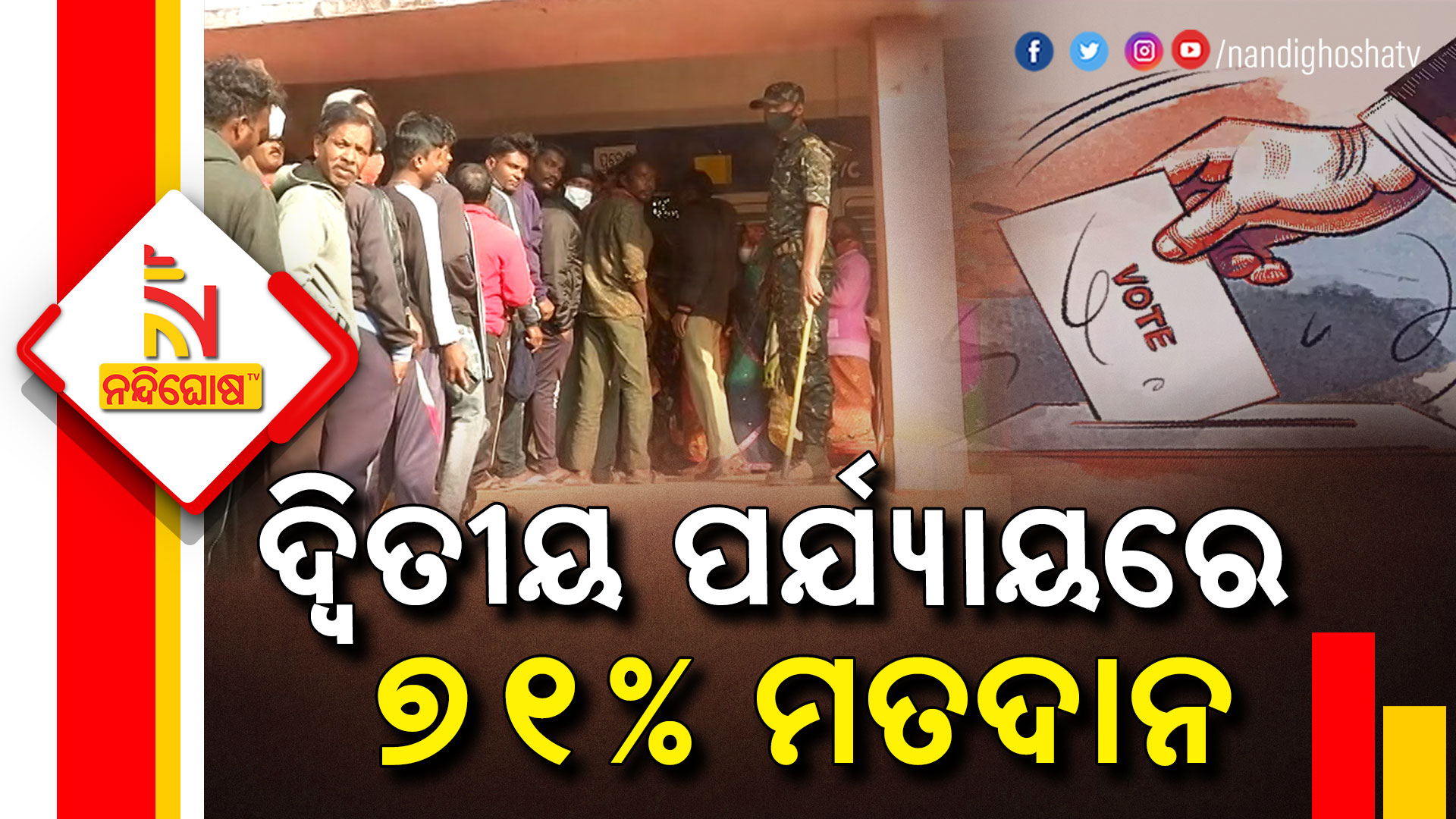 ବୁଥରେ ଧାଡ଼ିରେ ଯାଇ ଜଣେ ଭୋଟର ଦେଇଛନ୍ତି ୪ଟି ଭୋଟ୍ । ଓ୍ୱାର୍ଡ ମେମ୍ବର ପାଇଁ ହଳଦିଆ, ସରପଞ୍ଚ ପାଇଁ ଗୋଲାପି, ସମିତି ସଭ୍ୟ ପାଇଁ ନୀଳ ଓ ଜିଲ୍ଲା ପରିଷଦ ସଭ୍ୟ ପାଇଁ ଧଳା ବାଲଟ ପେପରରେ ଭୋଟର ନିଜ ପସନ୍ଦର ପ୍ରାର୍ଥୀଙ୍କ ଚିହ୍ନରେ ମୋହର ମାରିଛନ୍ତି । ଦ୍ୱିତୀୟ ପର୍ଯ୍ୟାୟରେ ୩୦ ଜିଲ୍ଲାର ୬୮ ବ୍ଲକର ୨୦ ହଜାର ୪୩୬ ବୁଥରେ ୧୮୬ ଜିଲ୍ଲା ପରିଷଦ ସଭ୍ୟ, ୧୫୧୪ ପଞ୍ଚାୟତର ସରପଞ୍ଚ, ସମିତି ସଭ୍ୟ ଓ ୱାର୍ଡ ସଭ୍ୟ ପାଇଁ ନିର୍ବାଚନ ସରିଛି । ୨୦୧୭ ନିର୍ବାଚନର ଦ୍ୱିତୀୟ ପର୍ଯ୍ୟାୟରେ ୭୭ ଦଶମିକ ୯୧ ପ୍ରତିଶତ ମତଦାନ ହୋଇଥିଲା । ଏଥର ୭୦ ପ୍ରତିଶତ ଟପିଛି ।