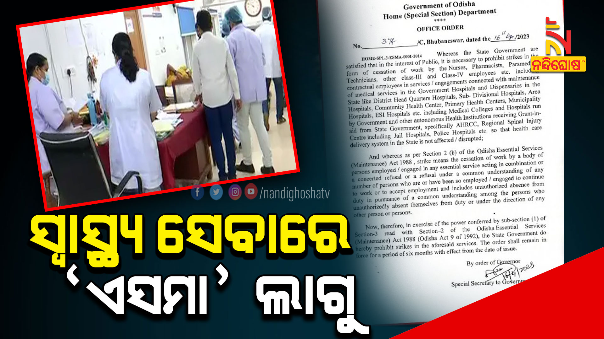 ସ୍ୱାସ୍ଥ୍ୟସେବାରେ ନିୟୋଜିତ କର୍ମଚାରୀଙ୍କ ପାଇଁ ଏସମା ଲାଗୁ ହୋଇଛି । ସବୁ ସରକାରୀ ଡାକ୍ତରଖାନା କର୍ମଚାରୀଙ୍କ ପାଇଁ ଲାଗୁହୋଇଛି ଅତ୍ୟାବଶ୍ୟକ ସେବା ଆଇନ୍ ବା  ଏସମା । ଛଅ ମାସ ପାଇଁ ବଳବତ୍ତର ରହିବ ଏସମା  । ଏହି ସମୟରେ ଡାକ୍ତରଖାନାର କୌଣସି କର୍ମଚାରୀ ଆନ୍ଦୋଳନ କରିପାରିବେ ନାହିଁ । ଗୃହବିଭାଗ ଲାଗୁ କରିଛି ଏସମା  ।