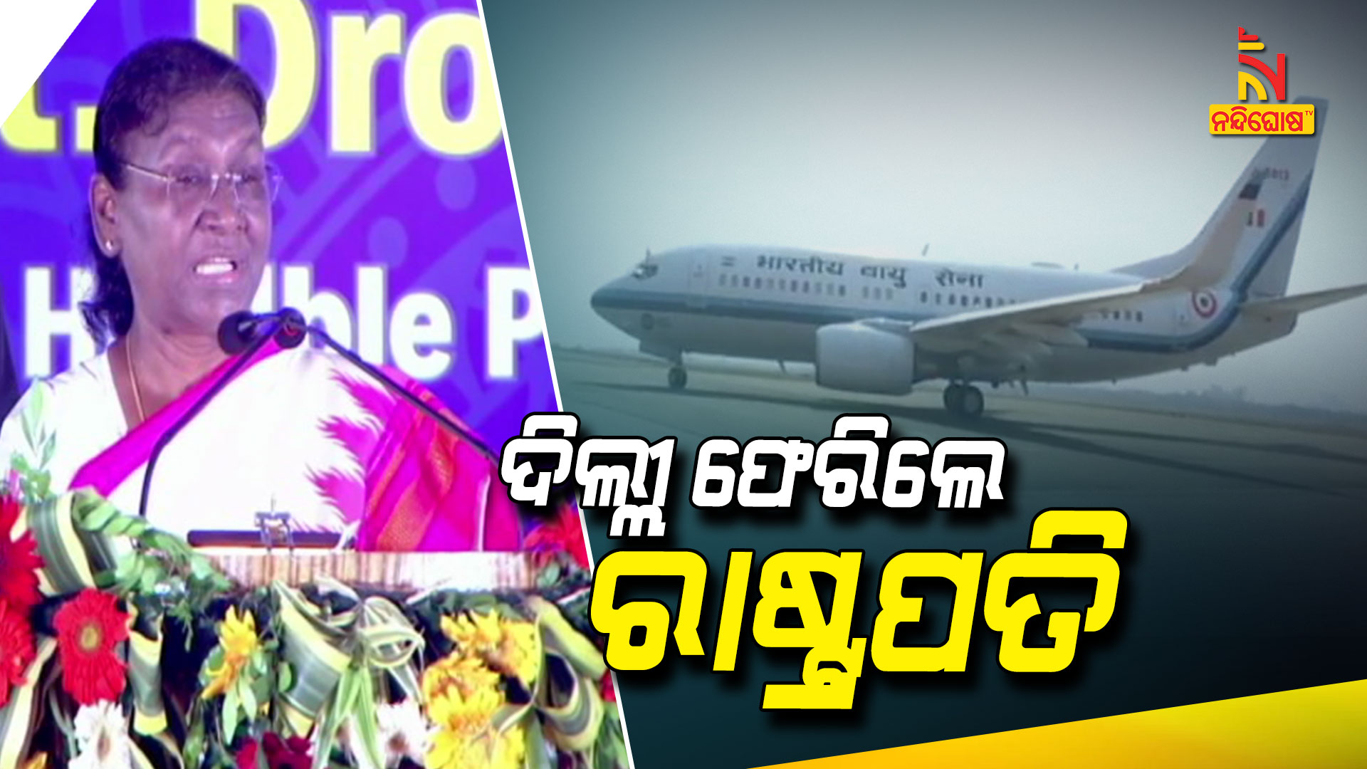 ଭୁବନେଶ୍ୱର: ତିନି ଦିନିଆ ଓଡିଶା ଗସ୍ତ ସାରି ଦିଲ୍ଲୀ ଫେରିଲେ ରାଷ୍ଟ୍ରପତି ଦ୍ରୌପଦୀ ମୁର୍ମୁ। ବାୟୁସେନାର ସ୍ବତନ୍ତ୍ର ବିମାନରେ ନୂଆଦିଲ୍ଲୀ ଫେରିଛନ୍ତି ରାଷ୍ଟ୍ରପତି। ରାଷ୍ଟ୍ରପତିଙ୍କୁ ବିମାନବନ୍ଦରରେ ବିଦାୟ ଦେଇଛନ୍ତି ରାଜ୍ୟପାଳ ପ୍ରଫେସର ଗଣେଶୀ ଲାଲ ଓ ମୁଖ୍ୟମନ୍ତ୍ରୀ ନବୀନ ପଟ୍ଟନାୟକ। ଓଡ଼ିଶା ଗସ୍ତ ବେଳେ ଭୁବନେଶ୍ୱର ଓ କଟକର ବିଭିନ୍ନ କାର୍ଯ୍ୟକ୍ରମରେ ସାମିଲ ହୋଇଥିଲେ ମହାମହିମ ରାଷ୍ଟ୍ରପତି ଦ୍ରୌପଦୀ ମୁର୍ମୁ।