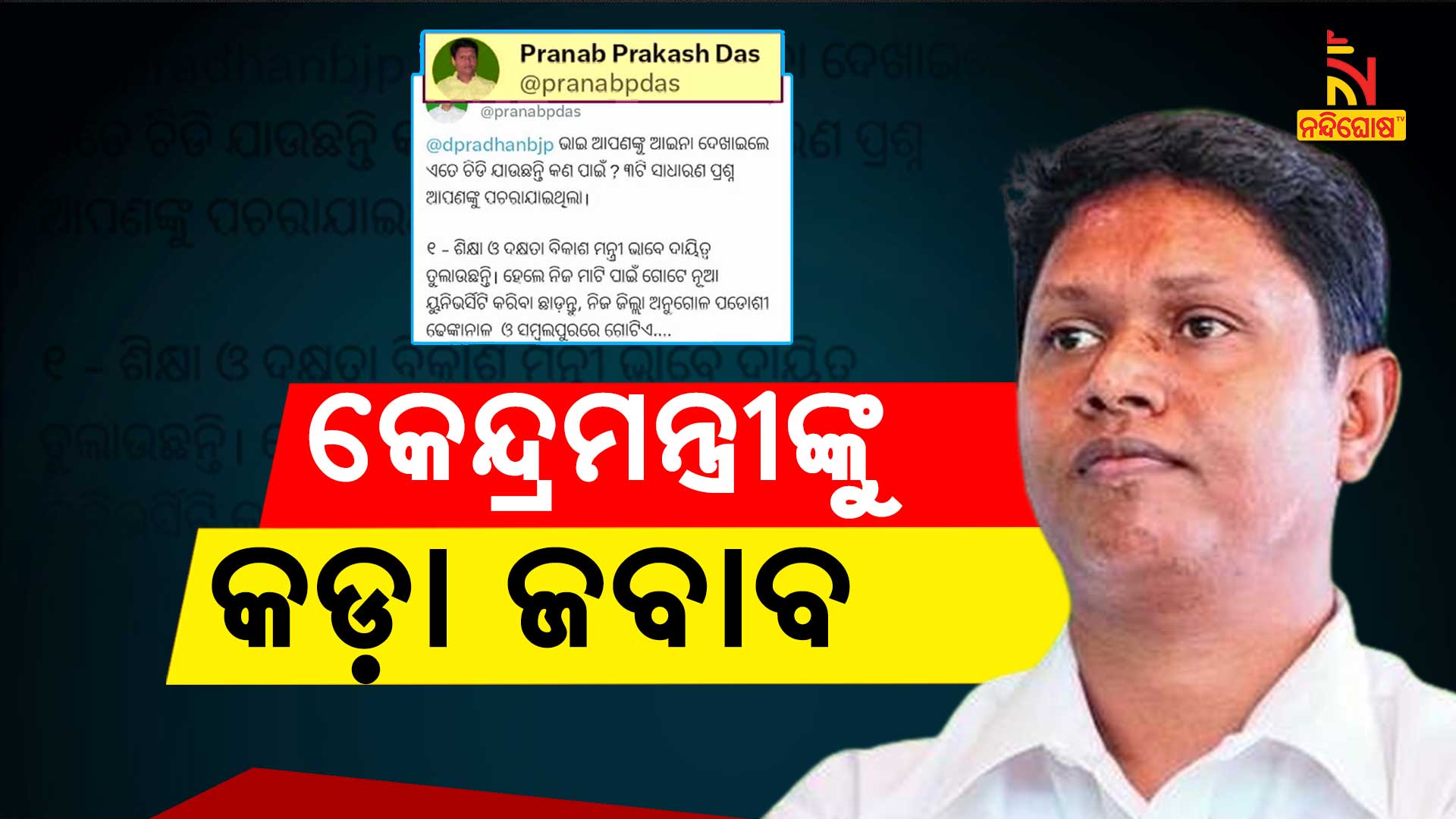 ତୃତୀୟରେ NH-55ର ଅବସ୍ଥା ଯାହା ରହିଛି ଗତ ୧୦ ବର୍ଷରେ କାମ ସରିପାରୁନି । ଜାତୀୟ ରାଜପଥ ଦେଇ ଆପଣ ଯିବା ବଦଳରେ ରାଜ୍ୟ ରାଜପଥକୁ ଭରସା କରୁଛନ୍ତି ବୋଲି ଧର୍ମେନ୍ଦ୍ରଙ୍କୁ କହି କଟାକ୍ଷ କରିଛନ୍ତି ପ୍ରଣବ । କେନ୍ଦ୍ରମନ୍ତ୍ରୀ ଭାବେ ଶ୍ରୀଯୁକ୍ତ କେ.ପି.ସିଂଦେଓ ଦାୟିତ୍ୱ ତୁଲାଇବାବେଳେ ଆଇଆଇଏମସି ସହ ଅନ୍ୟ କେନ୍ଦ୍ରୀୟ ପ୍ରକଳ୍ପ ନିଜ ଜିଲ୍ଲା ପାଇଁ କାର୍ଯ୍ୟକାରୀ କରିଥିଲେ । ଯଦି ପ୍ରଶ୍ନ ସବୁ ଶୁଣି ରାଗ ଓ ରକ୍ତଚାପ ବଢ଼ିଯାଉଛି, ତେବେ ନିୟମିତ ଭାବେ ଯୋଗ କରିବାକୁ ଧର୍ମେନ୍ଦ୍ରଙ୍କୁ ପରାମର୍ଶ ଦେଇଛନ୍ତି ପ୍ରଣବ । କିଛି ଦିନ ତଳେ ଜିଲ୍ଲା ଗସ୍ତ ସମୟରେ 5T ଅଧ୍ୟକ୍ଷ କାର୍ତ୍ତିକ ପାଣ୍ଡିଆନ୍ କେନ୍ଦ୍ରମନ୍ତ୍ରୀଙ୍କୁ ଏହି ସବୁ ପ୍ରଶ୍ନ କରିଥିଲେ । ଯାହାର ଉତ୍ତର ଆଜି ଯାଏଁ ଦେଇପାରିନାହାନ୍ତି ଧର୍ମେନ୍ଦ୍ର।
