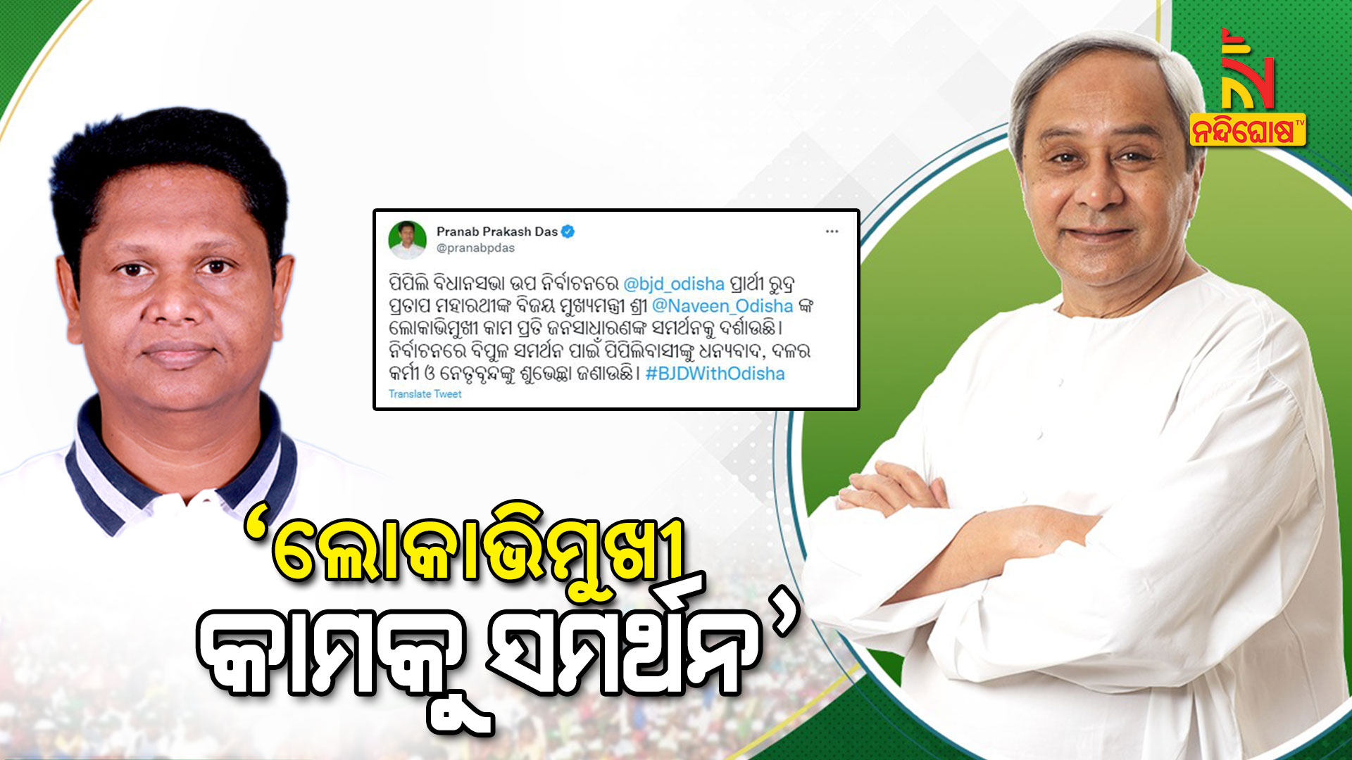 ପିପିଲି ବିଧାନସଭା ଉପ ନିର୍ବାଚନରେ @bjd_odisha ପ୍ରାର୍ଥୀ ରୁଦ୍ର ପ୍ରତାପ ମହାରଥୀଙ୍କ ବିଜୟ ମୁଖ୍ୟମନ୍ତ୍ରୀ ଶ୍ରୀ @Naveen_Odisha ଙ୍କ ଲୋକାଭିମୁଖୀ କାମ ପ୍ରତି ଜନସାଧାରଣଙ୍କ ସମର୍ଥନକୁ ଦର୍ଶାଉଛି। ନିର୍ବାଚନରେ ବିପୁଳ ସମର୍ଥନ ପାଇଁ ପିପିଲିବାସୀଙ୍କୁ ଧନ୍ୟବାଦ, ଦଳର କର୍ମୀ ଓ ନେତୃବୃନ୍ଦଙ୍କୁ ଶୁଭେଚ୍ଛା ଜଣାଉଛି। #BJDWithOdisha pic.twitter.com/xKmixcLtUe