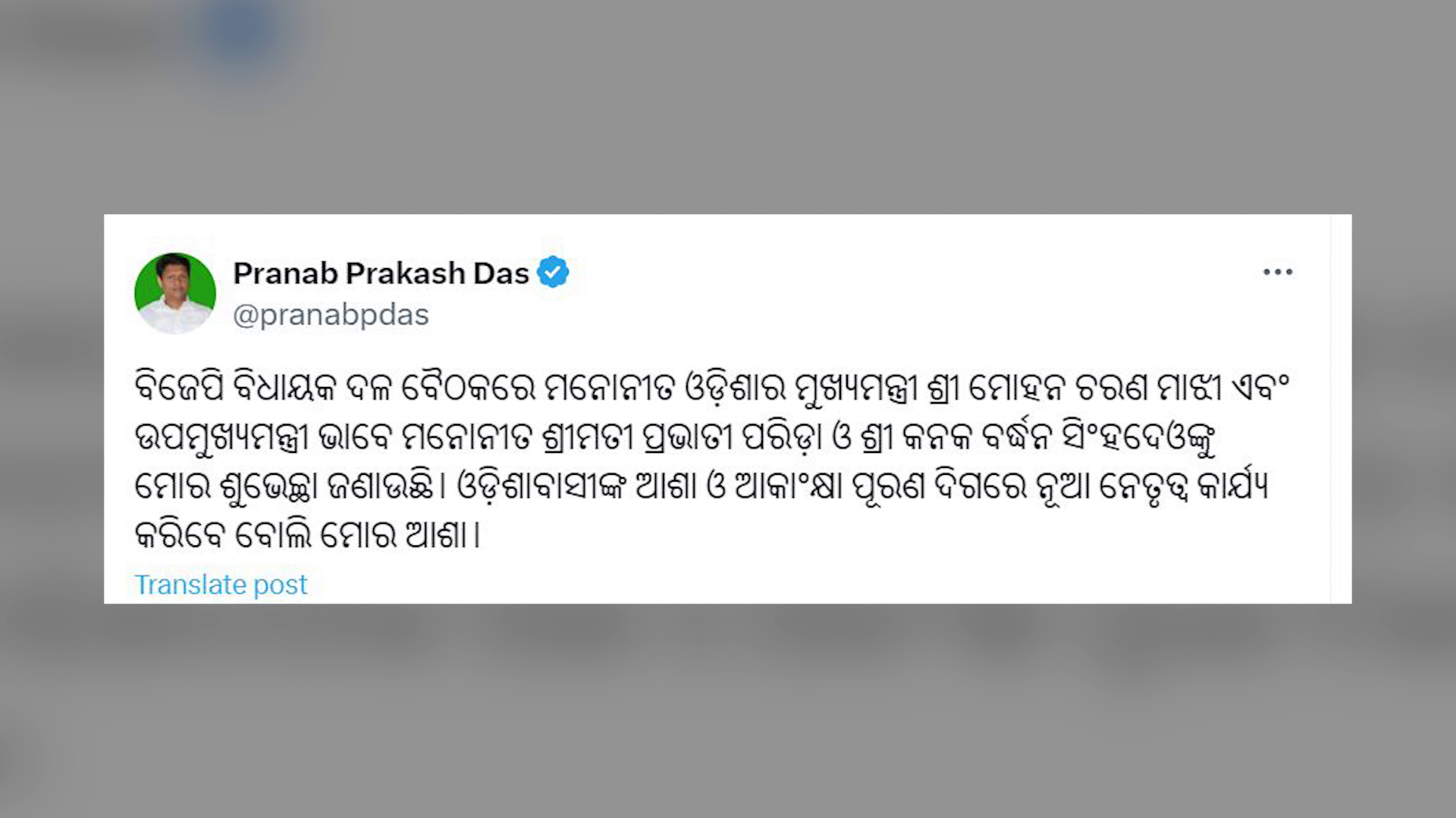 ନନ୍ଦିଘୋଷ ବ୍ୟୁରୋ: ନୂଆ ମୁଖ୍ୟମନ୍ତ୍ରୀ ଓ ଉପ ମୁଖ୍ୟମନ୍ତ୍ରୀଙ୍କୁ ଶୁଭେଚ୍ଛା ଜଣାଇଛନ୍ତି ବିଜେଡି ସାଙ୍ଗଠନିକ ସମ୍ପାଦକ ପ୍ରଣବ ପ୍ରକାଶ ଦାସ । ବିଜେପି ବିଧାୟକ ଦଳ ବୈଠକରେ ମନୋନୀତ ଓଡ଼ିଶାର ମୁଖ୍ୟମନ୍ତ୍ରୀ ମୋହନ ଚରଣ ମାଝୀ ଏବଂ ଉପମୁଖ୍ୟମନ୍ତ୍ରୀ ଭାବେ ମନୋନୀତ ପ୍ରଭାତୀ ପରିଡ଼ା ଓ କନକ ବର୍ଦ୍ଧନ ସିଂହଦେଓଙ୍କୁ ଶୁଭେଚ୍ଛା ଜଣାଇଛନ୍ତି । ଓଡ଼ିଶାବାସୀଙ୍କ ଆଶା ଓ ଆକାଂକ୍ଷା ପୂରଣ ଦିଗରେ ନୂଆ ନେତୃତ୍ଵ କାର୍ଯ୍ୟ କରିବେ ବୋଲି ମୋର ଆଶା ବୋଲି ନିଜ ସୋସିଆଲ ସାଇଟରେ ଉଲ୍ଲେଖ କରିଛନ୍ତି ପ୍ରଣବ ପ୍ରକାଶ ଦାସ।