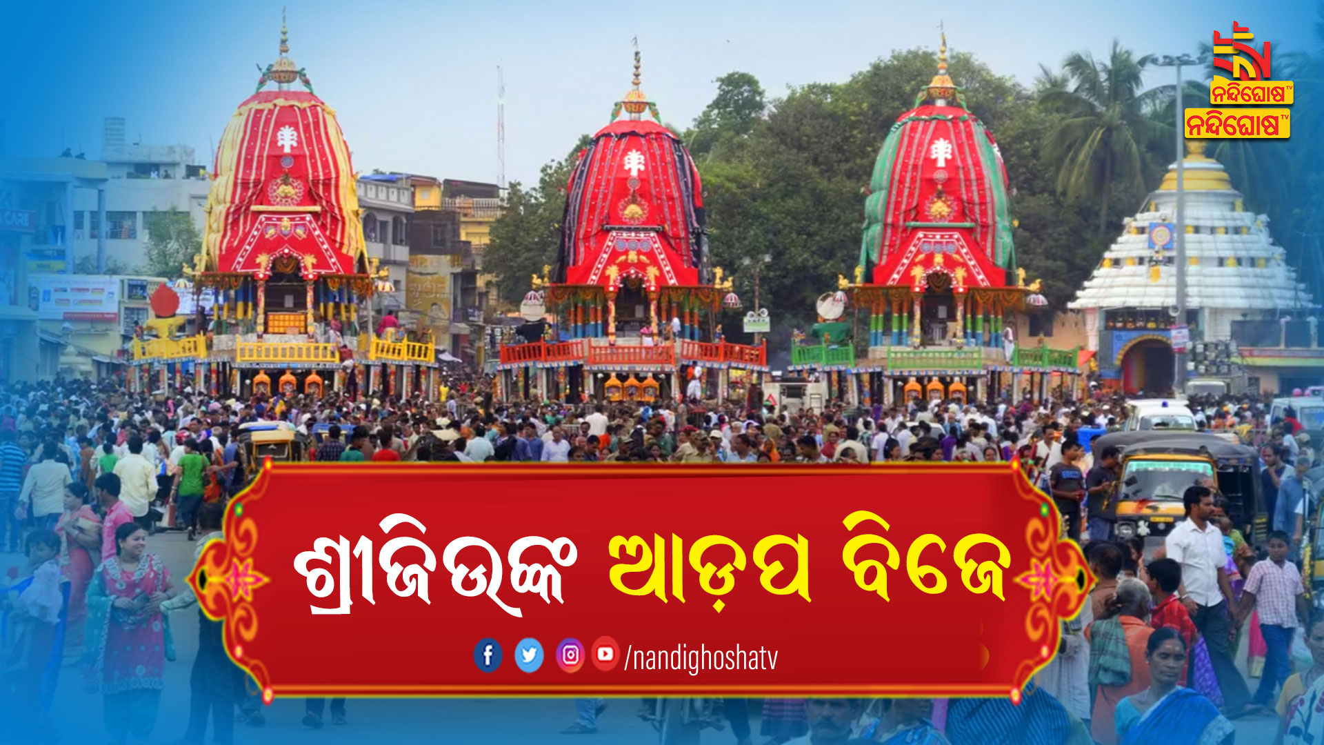 ପୁରୀ: ଶ୍ରୀଜିଉଙ୍କ ଆଡ଼ପ ବିଜେ । ଜନ୍ମବେଦୀରେ ଚାଲିବ ଲୀଳାଖେଳା । ରଥଯାତ୍ରାର ଆଜି ତୃତୀୟ ଦିନରେ ଶ୍ରୀଗୁଣ୍ଡିଚା ମନ୍ଦିର ଆଡ଼ପ ମଣ୍ଡପକୁ ବିଜେ କରିଛନ୍ତି ଶ୍ରୀବିଗ୍ରହ । ପରମ୍ପରା ଅନୁସାରେ ସନ୍ଧ୍ୟା ଧୂପ ପରେ ରଥରୁ ଘୋଡା ଖୋଲାଯାଇ ଚାରମାଳ ବନ୍ଧାଯାଇଥିଲା । ଏହାପରେ ପୁଷ୍ପାଞ୍ଜଳି ବନ୍ଦାପନା ଅନୁଷ୍ଠିତ ହୋଇ ଆରମ୍ଭ ହୋଇଥିଲା ପହଣ୍ଡି ନୀତି । ପ୍ରଥମେ ଚଳନ୍ତି ପ୍ରତିମା ମଦନମୋହନ, ରାମ କୃଷ୍ଣ ଶ୍ରୀଗୁଣ୍ଡିଚାକୁ ବିଜେ କରିବା ପରେ ଗୋଟି ପହଣ୍ଡିରେ ଯାଇଥିଲେ ଚକ୍ରରାଜ ସୁଦର୍ଶନ ।