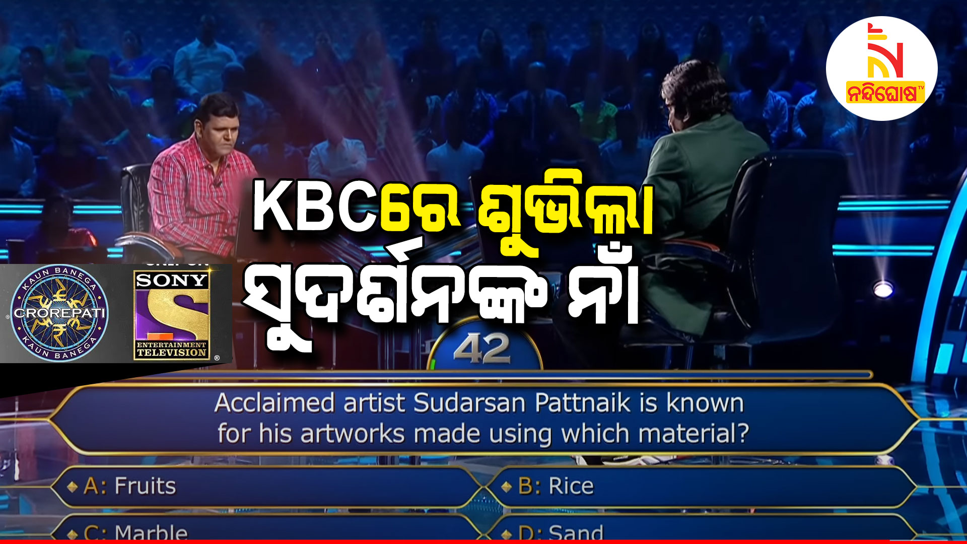 ନୂଆଦିଲ୍ଲୀ: ଜାତୀୟ ଟିଭି ଚ୍ୟାନେଲର ରିଆଲିଟି ସୋ’ରେ ଶୁଭିଲା ଓଡ଼ିଶାର ବାଲୁକା ଶିଳ୍ପୀ ସୁଦର୍ଶନ ପଟ୍ଟନାୟକଙ୍କ ନାଁ । ସୋନୀ ଟିଭିରେ ପ୍ରସାରିତ କୌନ୍ ବନେଗା କରୋଡପତିରେ ପଚରାଗଲା ପଦ୍ମଶ୍ରୀ ସୁଦର୍ଶନ ପଟ୍ଟନାୟକଙ୍କ କଳାକୃତି ନେଇ ପ୍ରଶ୍ନ । ହୋଷ୍ଟ ବିଗ୍ ବି ଅମିତାଭ ବଚ୍ଚନ ଆସିଥିବା ପ୍ରତିଯୋଗୀଙ୍କୁ ସୁଦର୍ଶନ ପଟ୍ଟନାୟକ କେଉଁ ସାମଗ୍ରୀରେ ତାଙ୍କ କଳାକୃତି ପ୍ରଦର୍ଶନ କରନ୍ତି ବୋଲି ପ୍ରଶ୍ନ କରିଥିଲେ । ଆଉ ପ୍ରତିଯୋଗୀ ସୁଦର୍ଶନ ପଟ୍ଟନାୟକ ବାଲିରେ ସୁନ୍ଦର କଳାକୃତି କରନ୍ତି ବୋଲି ଉତ୍ତର ଦେଇଥିଲେ ।