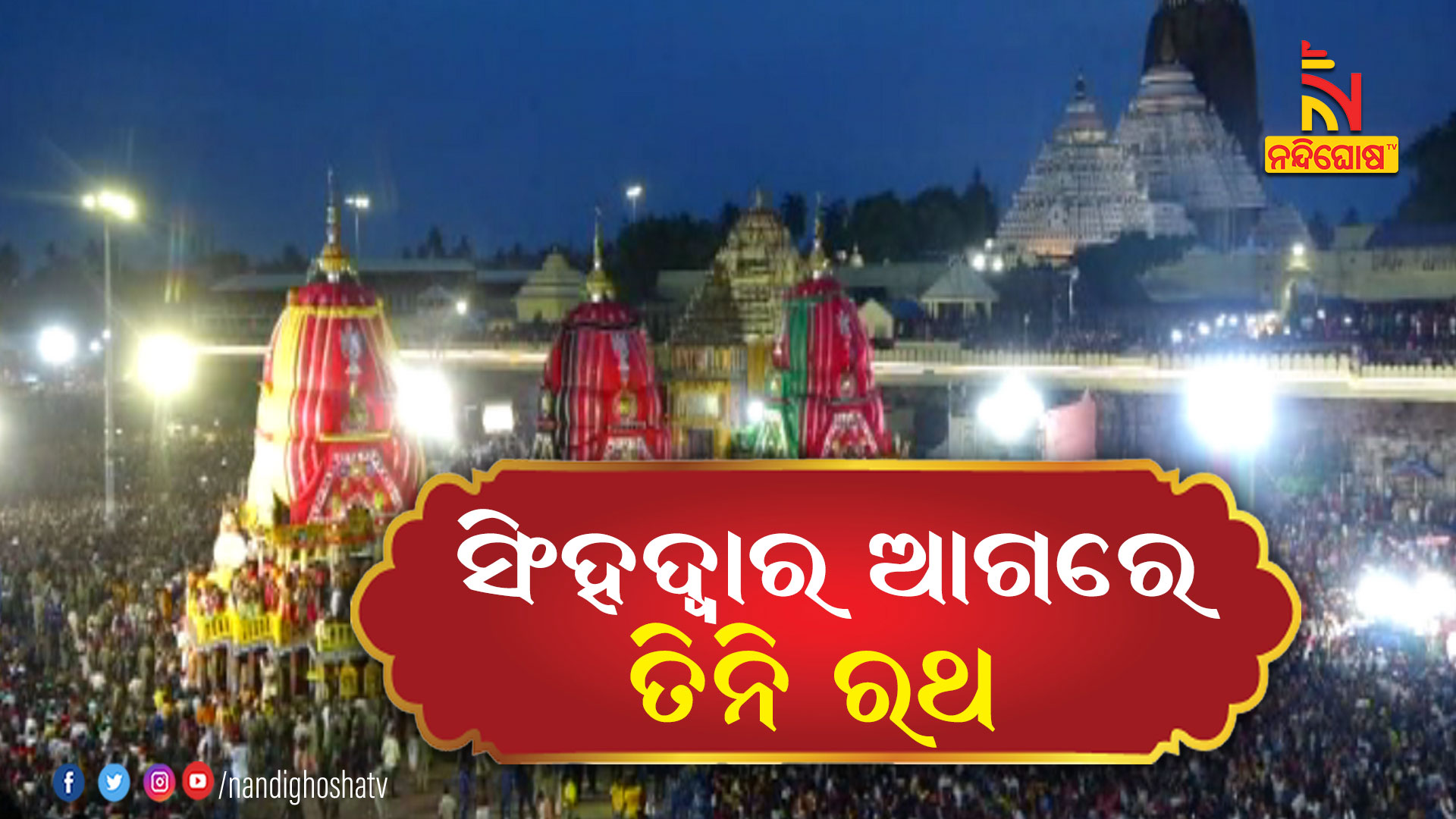 ପୁରୀ: ବାହୁଡ଼ିଲେ ଶ୍ରୀଜିଉ । ଗୁଣ୍ଡିଚା ମନ୍ଦିରରୁ ବାହାରି ଶ୍ରୀମନ୍ଦିର ସିଂହଦ୍ବାର ସମ୍ମୁଖରେ ଲାଗିଲା ତିନି ରଥ । ପ୍ରଥମେ ପ୍ରଭୁ ବଳଭଦ୍ର, ପରେ ଦେବୀ ସୁଭଦ୍ରା ଏବଂ ଶେଷରେ ମହାପ୍ରଭୁ ଜଗନ୍ନାଥଙ୍କ ରଥ ସିଂହଦ୍ବାର ସମ୍ମୁଖରେ ଲାଗିଥିଲା ।