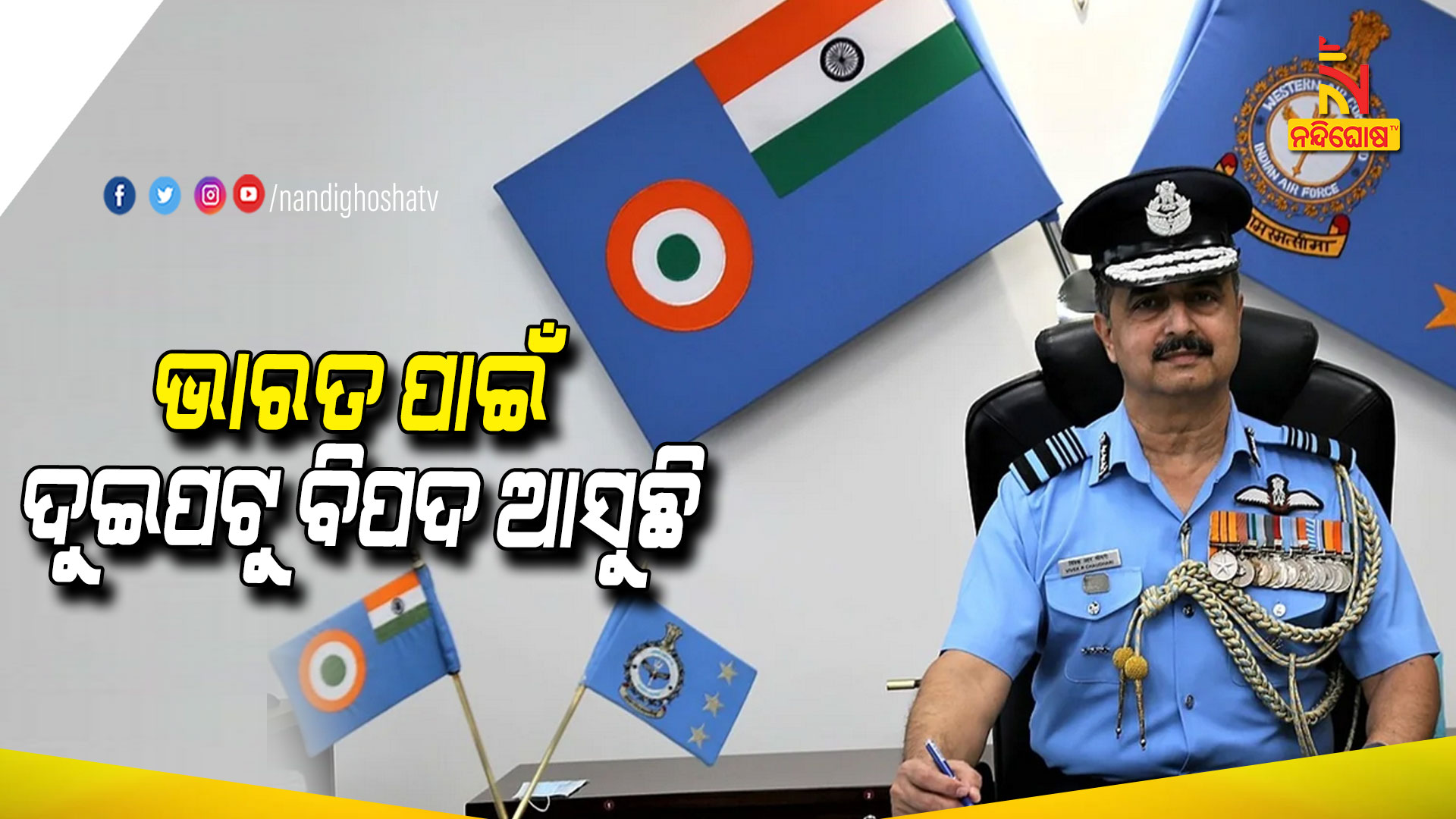 ବାୟୁସେନା ମୁଖିଆ ଏକ ଜାତୀୟ ଖବର ସରବରାହ ସଂସ୍ଥାକୁ ସ୍ୱତନ୍ତ୍ର ସାକ୍ଷାତକାରରେ କହିଛନ୍ତି ଭବିଷ୍ୟତରେ ଭାରତ ଉପରେ ସବୁ ପଟୁ ଆକ୍ରମଣ ହୋଇପାରେ । ଏପରି ସ୍ଥିତିରେ ଭାରତର ସୁରକ୍ଷା ସିଦ୍ଧାନ୍ତ ଏବଂ କ୍ଷମତାକୁ ସଶକ୍ତ କରାଯାଇ ଏହି ସ୍ଥିତିର ମୁକାବିଲା ପାଇଁ ପ୍ରସ୍ତୁତ ରହିବାକୁ ପଡିବ । ସେ ଆଗକୁ କହିଥିଲେ, ଏକ ରାଷ୍ଟ୍ର ଭାବେ ଆମେ ନିଜର ବର୍ତ୍ତମାନର ସ୍ଥିତି ଏବଂ ଭବିଷ୍ୟତର ବିପଦକୁ ଚିହ୍ନଟ କରିବାର ଆବଶ୍ୟକ ରହିଛି । ଯାହାଫଳରେ ଏଗୁଡିକର ମୁକାବିଲା କରିବା ପାଇଁ ଶକ୍ତିର ବିକାଶ କରାଯାଇ ପାରିବ । ସେ କହିଥିଲେ ଆମ ସମ୍ମୁଖରେ ପଶ୍ଚିମ ଏବଂ ଉତ୍ତର ସୀମାରେ କିଛି ଚ୍ୟାଲେଞ୍ଜ ରହିଛି । ଏପରି ସ୍ଥିତିରେ ଭାରତ ପାଇଁ ଗୁରୁତ୍ୱପୂର୍ଣ୍ଣ ହେଉଛି ସେ ଦୁଇଟି ଅସ୍ଥିର ସୀମାକୁ ଦୁଇଟି ଆକସ୍ମିକ ଯୁଦ୍ଧକ୍ଷେତ୍ର ଭାବେଦେଖୁ ଏବଂ ଏହାର ଅନୁସାରେ ପ୍ରସ୍ତୁତି କରୁ । ଆମର ଦୁଇ ପାରମ୍ପରିକ ଶତ୍ରୁ ପାକିସ୍ତାନ ଏବଂ ଚୀନ ଲଗାତାର ଭାରତୀୟ ସୀମାରେ ସୈନ୍ୟ ଗିତିବିଧି ବଢାଇ ଚାଲିଛନ୍ତି ।