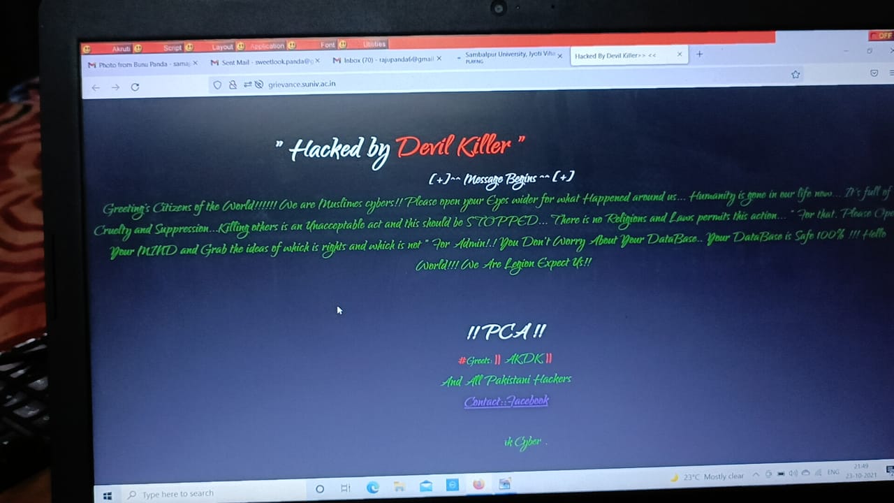 ସମ୍ବଲପୁର: ସମ୍ବଲପୁର ବିଶ୍ବବିଦ୍ୟାଳୟର ୱେବ୍ସାଇଟ୍ ହ୍ୟାକ୍ । ବିଶ୍ୱବିଦ୍ୟାଳୟର ଗ୍ରିଭାନ୍ସ ୱେବସାଇଟ ହ୍ୟାକ୍ ହୋଇଥିବା ଅଭିଯୋଗ ହୋଇଛି । ପାକିସ୍ତାନ ହ୍ୟାକର ୱେବସାଇଟ୍ ହ୍ୟାକ୍ କରିଥିବା ସୂଚନା ମିଳିଛି । ୱେବସାଇଟ୍ ଖୋଲିଲେ ହ୍ୟାକ୍ ବାଏ ଡେଭିଲ୍ କିଲର ସହ ଅଲ୍ ପାକିସ୍ତାନୀ ବୋଲି ଲେଖା ଆସୁଛି ।
