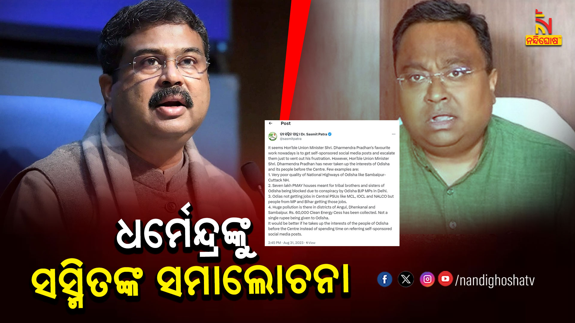 ଭୁବନେଶ୍ବର: ଓଡ଼ିଶା ସ୍ବାର୍ଥକୁ ଅଣଦେଖା । କେବଳ ପ୍ରାୟୋଜିତ ସୋସିଆଲ ମିଡିଆ ପ୍ରଚାରରେ ମାତିଛନ୍ତି କେନ୍ଦ୍ରମନ୍ତ୍ରୀ । ନିଜ ହତାଶ ଭାବର କରୁଛନ୍ତି ପରିପ୍ରକାଶ । ଏନେଇ କେନ୍ଦ୍ରମନ୍ତ୍ରୀ ଧର୍ମେନ୍ଦ୍ର ପ୍ରଧାନଙ୍କୁ ଟାର୍ଗେଟ୍ କରିଛନ୍ତି ବିଜେଡି ସାଂସଦ ସସ୍ମିତ ପାତ୍ର ।