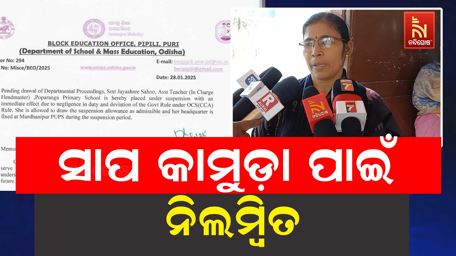 ନନ୍ଦିଘୋଷ ବ୍ୟୁରୋ : ପିପିଲି ପୋପରଙ୍ଗା ପ୍ରାଥମିକ ବିଦ୍ୟାଳୟ ଛାତ୍ରକୁ ସାପ କାମୁଡ଼ିବା ଘଟଣା । ଦାୟିତ୍ୱରେ ଥିବା ପ୍ରଧାନ ଶିକ୍ଷୟିତ୍ରୀ ଜୟଶ୍ରୀ ସାହୁଙ୍କୁ ନିଲମ୍ବନ କଲେ ପିପିଲି ବିଇଓ । କାର୍ଯ୍ୟରେ ଅବହେଳା ଅଭିଯୋଗରେ ନିଲମ୍ବନ କରାଯାଇଛି । ଗତକାଲି ପ୍ରଧାନ ଶିକ୍ଷୟିତ୍ରୀ ଓ ଶ୍ରେଣୀ ଶିକ୍ଷୟିତ୍ରୀ ଗୀତାଞ୍ଜଳି ରାଉତଙ୍କୁ ଅନ୍ୟ ବିଦ୍ୟାଳୟକୁ ବଦଳି କରାଯାଇଥିଲା। ବର୍ତ୍ତମାନ ପ୍ରଧାନ ଶିକ୍ଷୟିତ୍ରୀଙ୍କୁ ଚାକିରୀରୁ ନିଲମ୍ବନ କରାଯାଇଛି। ଗତ ସୋମବାର ଅପରାହ୍ନ ୪ଟାରେ ସ୍କୁଲର ଚତୁର୍ଥ ଶ୍ରେଣୀ ଛାତ୍ର ସାଇ କ୍ରୀଷ୍ଣା ପ୍ରଧାନଙ୍କୁ ସାପ କାମୁଡିଥିଲା। ବିଦ୍ୟାଳୟ ଗୃହ ସଫା କରୁଥିବା ସମୟରେ ସାପ କାମୁଡିଥିଲା । ଛାତ୍ର ଜଣକ କ୍ୟାପିଟାଲ ହସ୍ପିଟାଲରେ ଚିକିତ୍ସିତ ହେଉଥିବା ବେଳେ ଏବେ ସ୍ୱାସ୍ଥ୍ୟାବସ୍ଥା ସ୍ଥିର ରହିଛି।