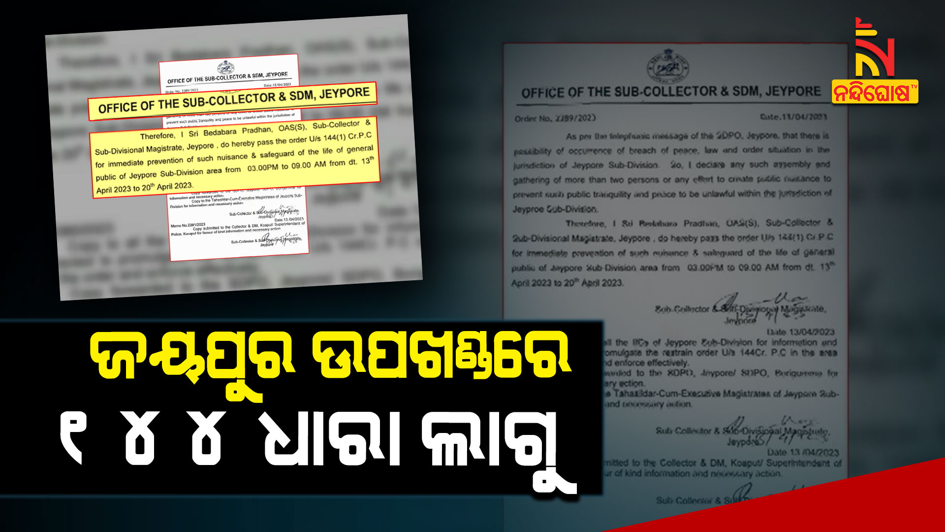 ଜୟପୁର: ଜୟପୁର ଉପଖଣ୍ଡରେ ଲାଗିଲା ୧୪୪ ଧାରା । ଆଇନଶୃଙ୍ଖଳା ପରିସ୍ଥିତି ସୃଷ୍ଟି ହେବାକୁ ଆଶଙ୍କା କରି ଜୟପୁରରେ ଲାଗୁ ହୋଇଛି ୧୪୪ ଧାରା । ଆଜିଠୁ ଆସନ୍ତା ୨୦ ତାରିଖ ପର୍ଯ୍ୟନ୍ତ ୭ ଦିନ ପର୍ଯ୍ୟନ୍ତ କଟକଣା ଜାରି ରହିବ । ପ୍ରତିଦିନ ଅପରାହ୍ନ ୩ଟାରୁ ପରଦିନ ସକାଳ ୯ଟା ଯାଏ ୧୪୪ ଧାରା ବଳବତ୍ତର ରହିବ । କୌଣସି ସ୍ଥାନରେ ଦୁଇରୁ ଅଧିକ ଲୋକ ଏକତ୍ରିତ ହୋଇପାରିବେ ନାହିଁ ।