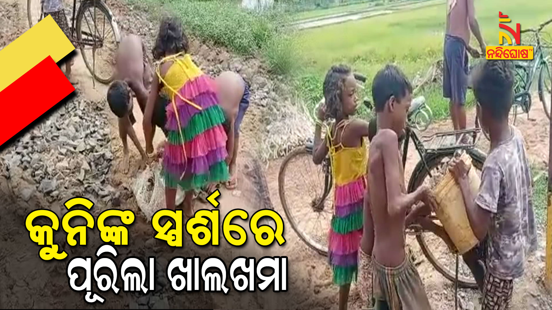 ଭଦ୍ରକ: ତୁମ ପରି ଛୋଟ ପିଲାଟିଏ, ରାସ୍ତା ସମତୁଲ କରିବା ପାଇଁ ଅଣ୍ଟା ଭିଡ଼ିଲେ। କୁନି କୁନି ପିଲାଙ୍କ ରାସ୍ତା ସମତୁଲ ଚିନ୍ତା, ରାସ୍ତା କଡରେ ପଡ଼ିଥିବା ଗୋଡିକୁ ବୋହି ନେଇ ଖାଲରେ ପକାଇ ସମତୁଲ କରିବାର ପ୍ରୟାସ। କିଏ ଅଖାରେ ବୋହି ନେଇଯାଉଛନ୍ତି ତ ଆଉ କିଏ ସାଇକେଲରେ ନେଇ ରାସ୍ତାରେ ଥିବା ଖାଲରେ ଢାଳି ସମାନ କରୁଛନ୍ତି। ଏହି ଚିତ୍ର ବୟାନ କରୁଛି, ଛୋଟ ପିଲା ବେଳେ ବହିରେ ପଢ଼ୁଥିବା ତୁମ ପରି ଛୋଟ ପିଲା ଟିଏ ଗାଁ ଚାହାଳୀର ଚାଟ ସିଏ ଉକ୍ତିଟି। ଦୃଶ୍ୟ ହେଉଛି ଭଦ୍ରକ ଗେଲଟୁଆ ଆଦିବାସୀ କଲୋନୀ ଠାରୁ ବଗମରା ଗାଁକୁ ସଂଯୋଗ କରୁଥିବା ରାସ୍ତାର।