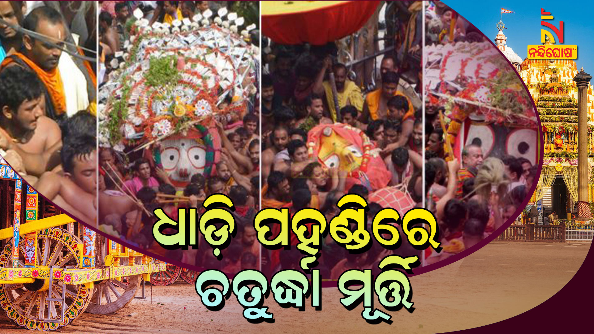 ପୁରୀ: ଆଜି ହେଉଛି ମହାପ୍ରଭୁଙ୍କର ଘୋଷଯାତ୍ରା। ଅଣସରରୁ ବାହାରିବା ପରେ ମାଉସୀ ଘର ପୋଡ଼ ପିଠା ଆଉ ଜନ୍ମବେଦି କଥା ମନେପଡ଼ିଛି ମହାପ୍ରଭୁଙ୍କର। ସେଥିପାଇଁ ତ ଘରେ ମହାଲକ୍ଷ୍ମୀଙ୍କୁ ଛାଡ଼ି ଭାଇ ବଳଭଦ୍ର ଏବଂ ଭଉଣୀ ଶୁଭଦ୍ରାଙ୍କୁ ଧରି ବାହାରିଛନ୍ତି ମହାପ୍ରଭୁ। ବଡ଼ଦାଣ୍ଡରେ ଘଡ଼ ଘଡ଼ ହୋଇ ଜନ୍ମବେଦିକୁ ଗଡ଼ିଯିବେ ନଟିଆ ଠାକୁର ନଟବର। ବଡ଼ଦାଣ୍ଡରେ ପ୍ରସ୍ତୁତ ୩ ରଥ। ପଥବି ତା ଛାତି ଉପରେ ରଥକୁ ଗଡ଼ାଇବା ପାଇଁ ପୁରା ପ୍ରସ୍ତୁତ ହୋଇ ରହିଛି। ଧାଡ଼ି ପହଣ୍ଡିରେ ରଥ ଉପରକୁ ଛୁଟିଆସିବେ ରତୁର୍ଦ୍ଧାମୂର୍ତ୍ତି।