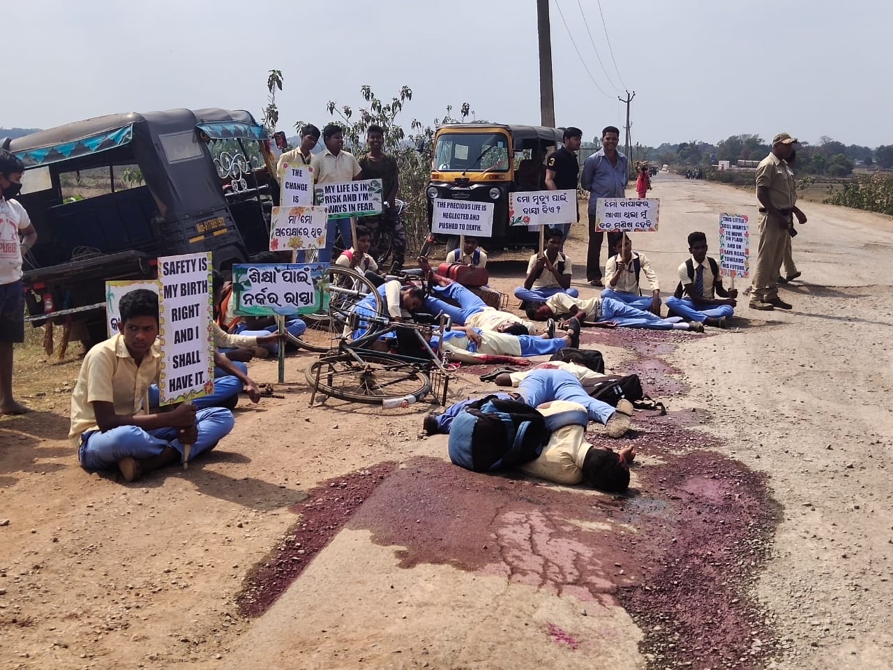 ପ୍ରସାଶନକୁ ଚେତାଇବାକୁ ଛାତ୍ରଛାତ୍ରୀଙ୍କ ଅଭିନବ ପ୍ରତିବାଦ, ରାସ୍ତାରେ ଦୁର୍ଘଟଣାର ନାଟକ