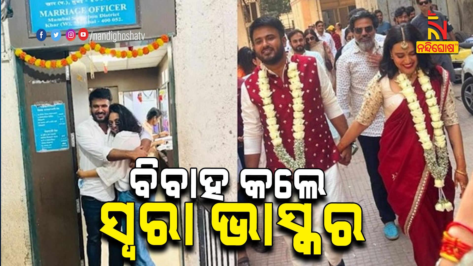 ମୁମ୍ବାଇ: ସମାଜବାଦୀ ପାର୍ଟି ନେତା ଫାହଦ ଅହମ୍ମଦଙ୍କ ହାତ ଧରିଲେ ଅଭିନେତ୍ରୀ ସ୍ୱରା ଭାସ୍କର। ଗତ ଜାନୁଆରୀ ୬ରେ ସ୍ବତନ୍ତ୍ର ବିବାହ ଆଇନ ଅନୁସାରେ ଉଭୟ କୋର୍ଟରେ ପଞ୍ଜିକରଣ କରିଥିବା ବିଷୟ ପ୍ରକାଶ କରିଛନ୍ତି ଅଭିନେତ୍ରୀ । ବର୍ତ୍ତମାନ ସମାଜବାଦୀ ପାର୍ଟିର ମହାରାଷ୍ଟ୍ର ଯୁବ ଶାଖା ସଭାପତି ଅଛନ୍ତି ଫାହଦ। ବିବାହ ପଞ୍ଜିକରଣ ବେଳେ କୋର୍ଟରେ ଉପସ୍ଥିତ ଥିଲେ ସ୍ବରାଙ୍କ ବାପାମା ।