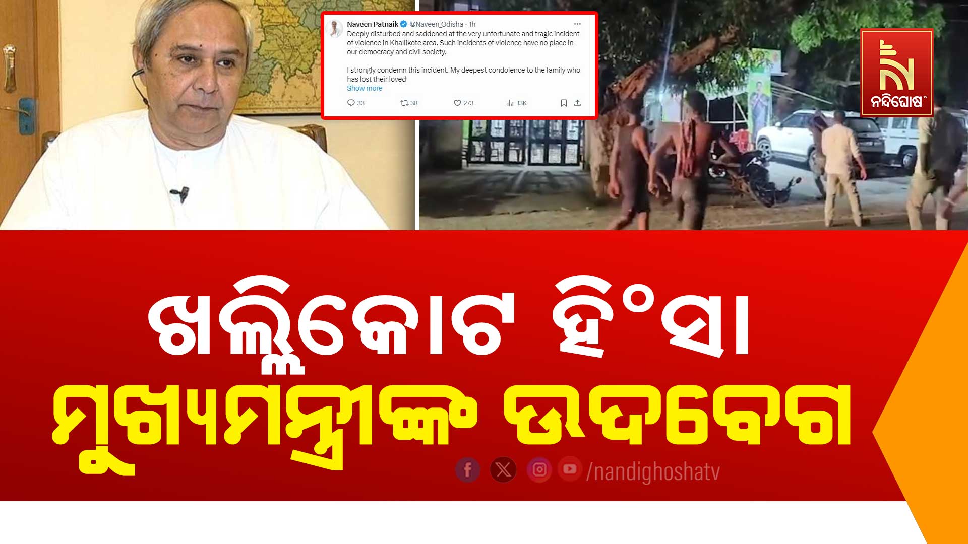 ଭୁବନେଶ୍ୱର : ଖଲ୍ଲିକୋଟ ହିଂସା ଘଟଣାରେ ମୁଖ୍ଯମନ୍ତ୍ରୀ ନବୀନ ପଟ୍ଟନାୟକ ଉଦବେଗ ପ୍ରକାଶ କରିଛନ୍ତି । ସୋସିଆଲ ମିଡିଆ ଏକ୍ସରେ ପ୍ରତିକ୍ରିୟା ରଖି ନବୀନ କହିଛନ୍ତି, ଏଭଳି ଘଟଣା ପାଇଁ ସେ ମର୍ମାହତ ଓ ଦୁଃଖିତ । ଗଣତନ୍ତ୍ର ପାଇଁ ଏହା ଶୁଭଙ୍କର ନୁହେଁ । ମୃତ ବ୍ଯକ୍ତିଙ୍କ ଶୋକସନ୍ତପ୍ତ ପରିବାରକୁ ସେ ସମବେଦନା ଜଣାଇବା ସହ ଆହତଙ୍କ ଆଶୁ ଆରୋଗ୍ଯ କାମନା କରିଛନ୍ତି । ଗଞ୍ଜାମ ଜିଲ୍ଲା ଖଲ୍ଲିକୋଟ ନିର୍ବାଚନମଣ୍ଡଳିରେ ଗତକାଲିଠାରୁ ନିର୍ବାଚନୀ ହିଂସା ଦେଖିବାକୁ ମିଳିଛି । କୃଷ୍ଣଶରଣପୁରଠାରେ ପୋଷ୍ଟର ମରାକୁ କେନ୍ଦ୍ର କରି ବିଜେଡି ଓ ବିଜେପି କର୍ମୀଙ୍କ ମଧ୍ଯରେ ମୁହାଁମୁହିଁ ପରିସ୍ଥିତି ଏବଂ ଆକ୍ରମଣ ଓ ପ୍ରତିଆକ୍ରମଣ ହୋଇଥିଲା । ଏଥିରେ ବିଜେଡିର ୮ ଜଣ କର୍ମୀ ଗୁରୁତର ହୋଇଥିବାବେଳେ ବିଜେପିର ଜଣେ କର୍ମୀଙ୍କର ମୃତ୍ଯୁ ହୋଇଛି । ମୃତକ ହେଲେ ଦିଲ୍ଲୀପ ପାହାନ । ବିଜେଡିର ୮ ଜଣ ଗୁରୁତରଙ୍କୁ ବ୍ରହ୍ମପୁର ଏମକେସିଜିରେ ଭର୍ତ୍ତି କରାଯାଇଛି । ଗତକାଲି ମଧ୍ଯରାତ୍ରିରେ ଖଲ୍ଲିକୋଟ ବିଜେଡି ବିଧାୟକ ତଥା ପ୍ରାର୍ଥୀ ସୂର୍ଯ୍ୟମଣି ବୈଦ୍ଯଙ୍କ ଭାସଭବନ ସାମ୍ନାରେ ବିଜେପି କର୍ମୀମାନେ ଅଭାବନୀୟ ପରିସ୍ଥିତି ସୃଷ୍ଟି କରିଥିଲେ । ଘର ସାମ୍ନାରେ ଥିବା ଗାଡ଼ିଗୁଡ଼ିକୁ ଠେଙ୍ଗା ଓ ଲୁହା ରଡରେ ବାଡ଼େଇ ଚୂରମାର କରିଛନ୍ତି । ଆଜି ସକାଳୁ କିଛି ବିଜେପି କର୍ମୀ ଖଲ୍ଲିକୋଟ ଥାନା ଆଗରେ ରୁଣ୍ଡ ହୋଇଛନ୍ତି । ଘଟଣାକୁ ଦୃଷ୍ଟିରେ ରଖି ପୋଲିସ ପ୍ରଶାସନ ପକ୍ଷରୁ ସୁରକ୍ଷା ବ୍ଯବସ୍ଥାକୁ ବଢ଼ାଯାଇଛି ।