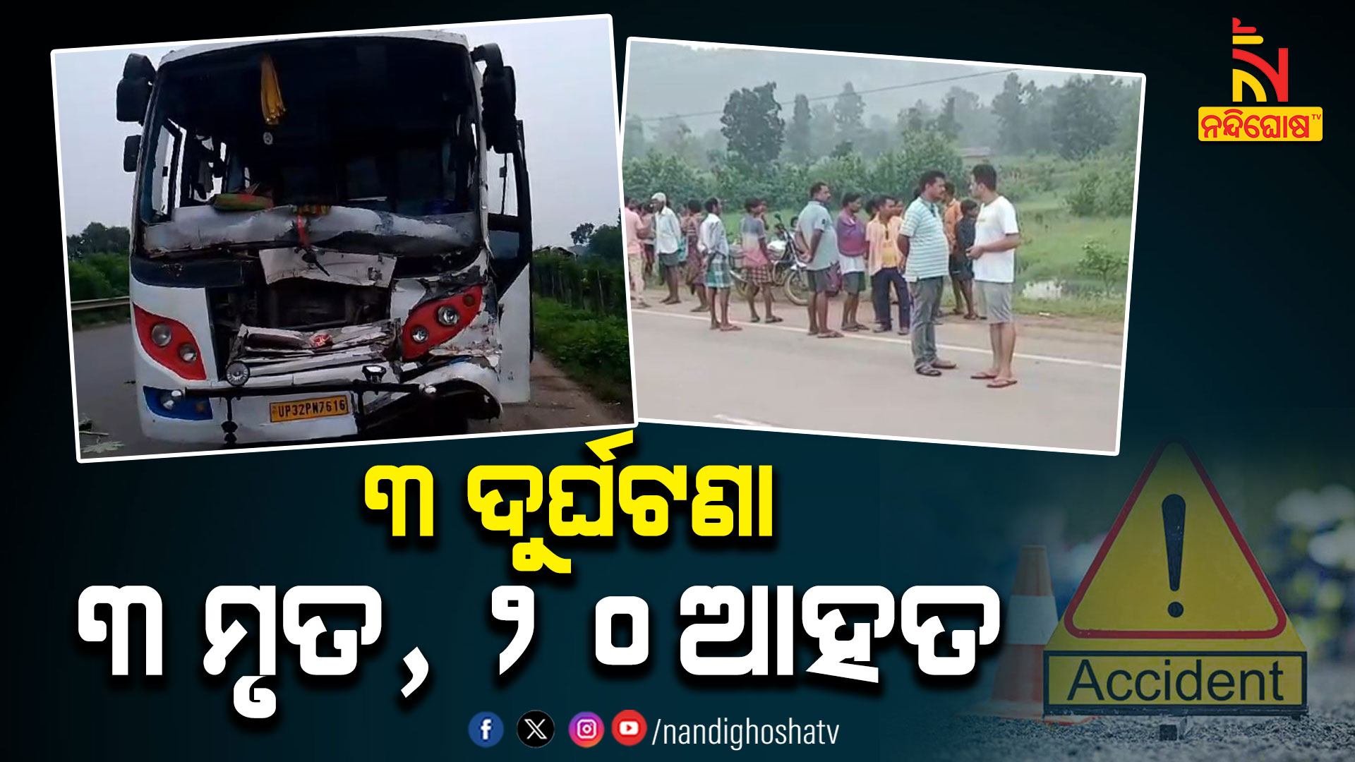 ଭୁବନେଶ୍ବର: ରବିବାର ସକାଳୁ ସକାଳୁ ଭିନ୍ନ ଭିନ୍ନ ସ୍ଥାନରୁ ଆସିଛି ଦୁଃଖଦ ଖବର । ଦୁଇଟି ସ୍ଥାନରେ ଦୁର୍ଘଟଣାରେ ମର୍ଣ୍ଣିଂ ଓ୍ବାକ କରୁଥିବା ବେଳେ ୩ ଯୁବକଙ୍କ ମୃତ୍ୟୁ ଘଟିଛି । ଗୋଟିଏ ସ୍ଥାନରେ ଶ୍ରୀକ୍ଷେତ୍ର ଯାଉଥିବା ତୀର୍ଥଯାତ୍ରୀ ବସ୍ ଦୁର୍ଘଟଣାଗ୍ରସ୍ତ ହୋଇ ୨୦ରୁ ଅଧିକ ପର୍ଯ୍ୟଟକ ଆହତ ହୋଇଛନ୍ତି ।