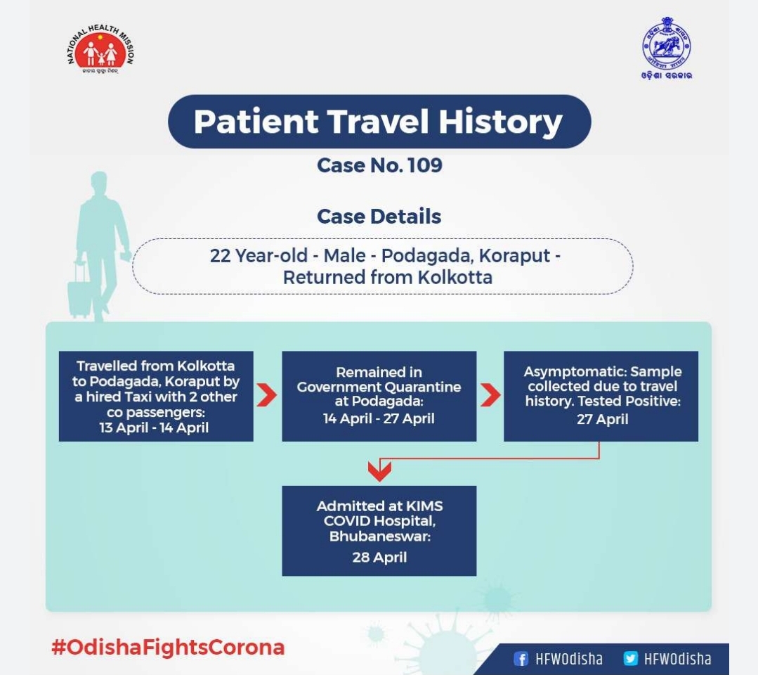 ଭୁବନେଶ୍ୱର : ୧୦୯ ନମ୍ବର କରୋନା ସଂକ୍ରମିତଙ୍କ ଯାତ୍ରାବିବରଣୀ ସୂଚନା ଓ ଲୋକସମ୍ପର୍କ ବିଭାଗ ତରଫରୁ ଜାରି କରାଯାଇଛି । କୋରାପୁଟ ପୋଡାଗଡର ଏହି ସଂକ୍ରମିତଙ୍କ କୋଲକତା ଲିଙ୍କ୍ ରହିଛି । ସେ ଜଣ ନର୍ସ । ସେ କିଛି ଦିନ ତଳେ କୋଲକତା ଯାଇଥିଲେ । ଏପ୍ରିଲ ୧୩ ଓ ୧୪ ତାରିଖରେ ସେ ଗୋଟିଏ ଟ୍ୟାକ୍ସି ଭଡା କରି କୋଲକତାରୁ ଅନ୍ୟ ଦୁଇଜଣଙ୍କ ସହ ପୋଡାଗଡ ଫେରିଥିଲେ ।